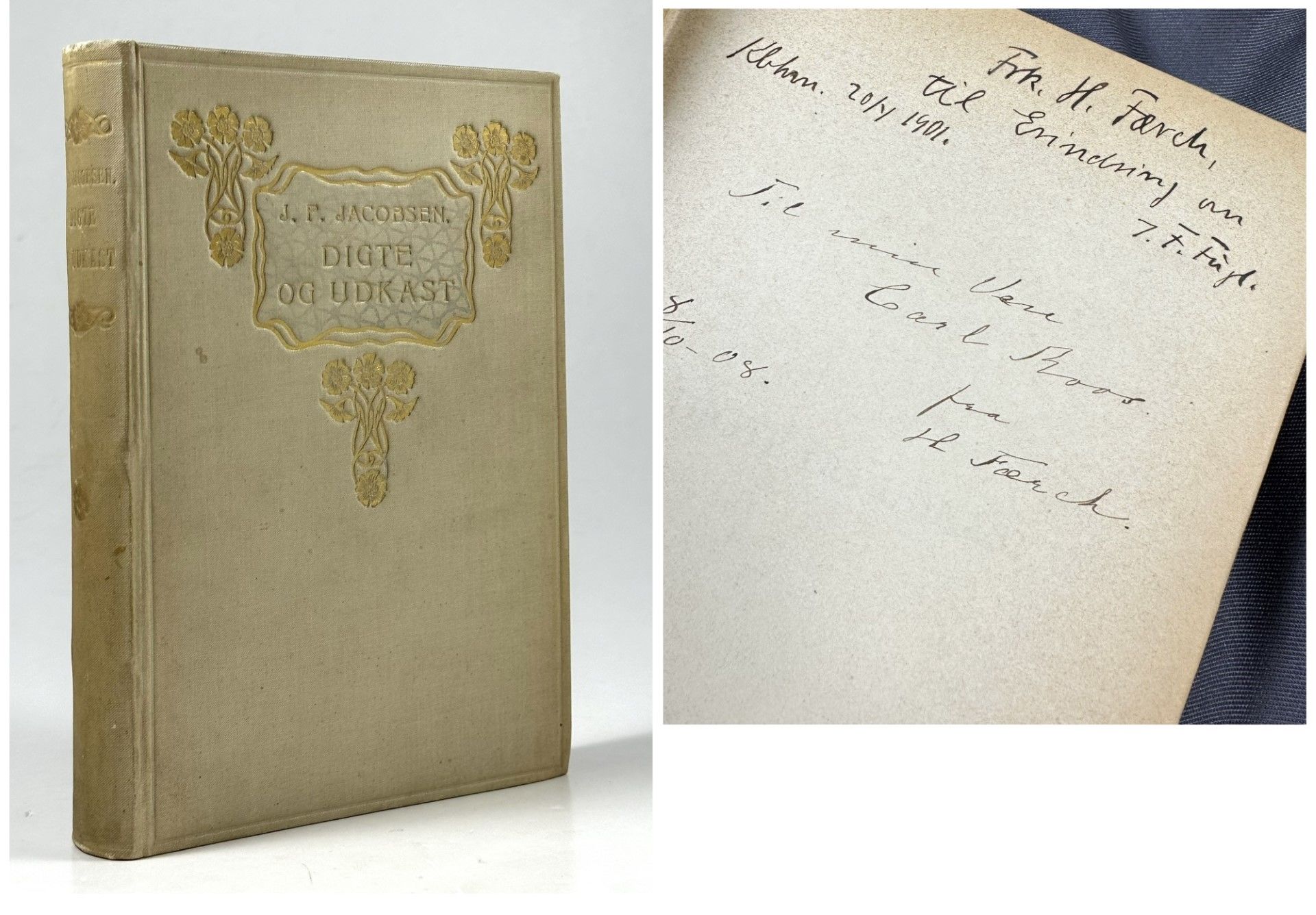 Gyldendal, København 1900. Andet Oplag. (6)+213 sider. Med forfatterens portræt raderet af Axel Helsted. Orig. komponeret hvidt helshirtingsbind. Tilskrifter på fribladet. Bindet lidt mørknet.