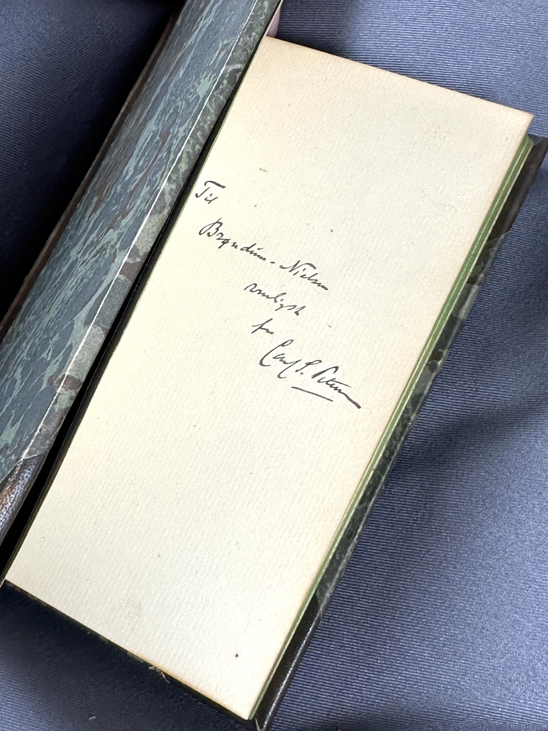 Gyldendal, København 1920. 8vo. 158 sider. Indbundet med orig. omslag i halvbind af brunmarmoreret kalveskind.
