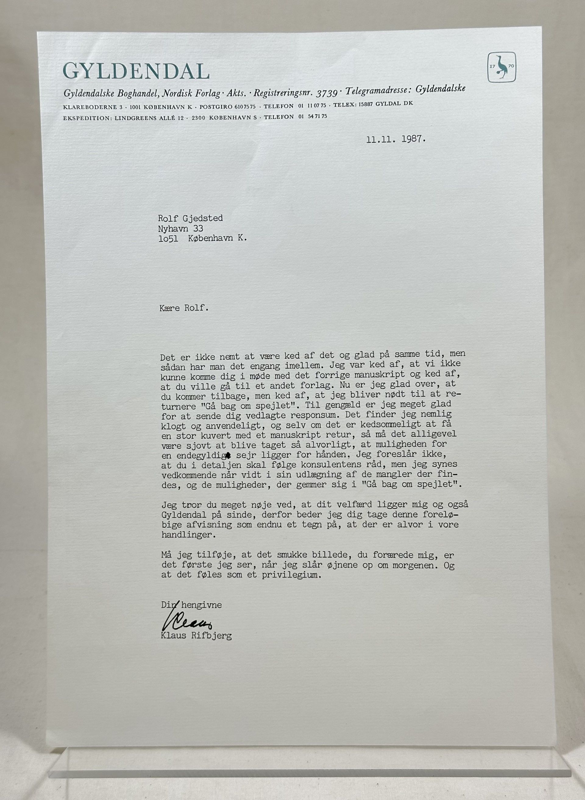 Maskinskrevet brev, 21 linjer med underskrift, på fortrykt brevpapir (Gyldendal), til Rolf (Gjedsted). Dateret 11. november 1987.