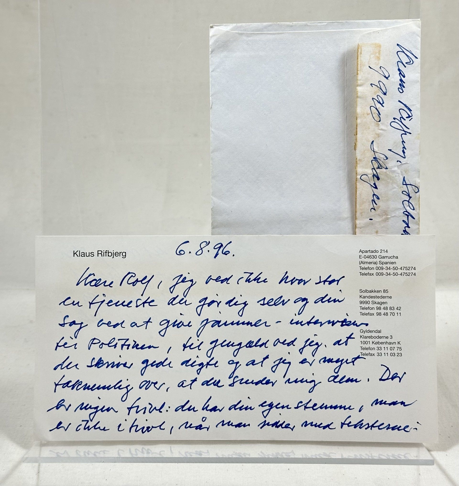 Håndskrevet brev, 13 linjer med underskrift, på fortrykt brevpapir, til Rolf (Gjedsted). Dateret 6. oktober 1996. Med tilhørende frankeret kuvert.