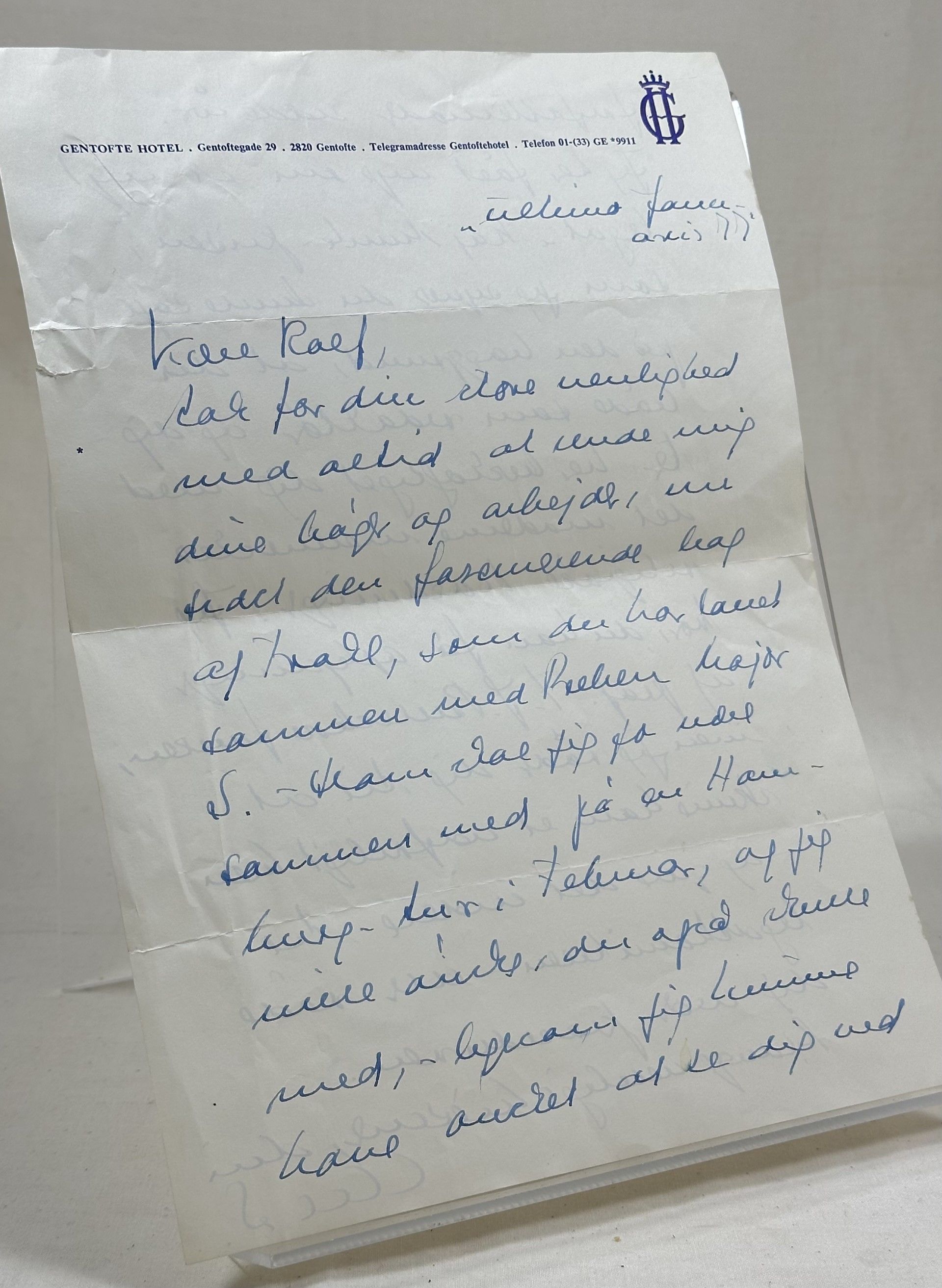 Langt (2 sider på 1 ark) håndskrevet brev (28 linjer med underskrift Ole S.) til Rolf (Gjedsted). På fortrykt brevpapir (Gentofte Hotel). Dateret (19)77. Brevpapiret lidt krøllet.