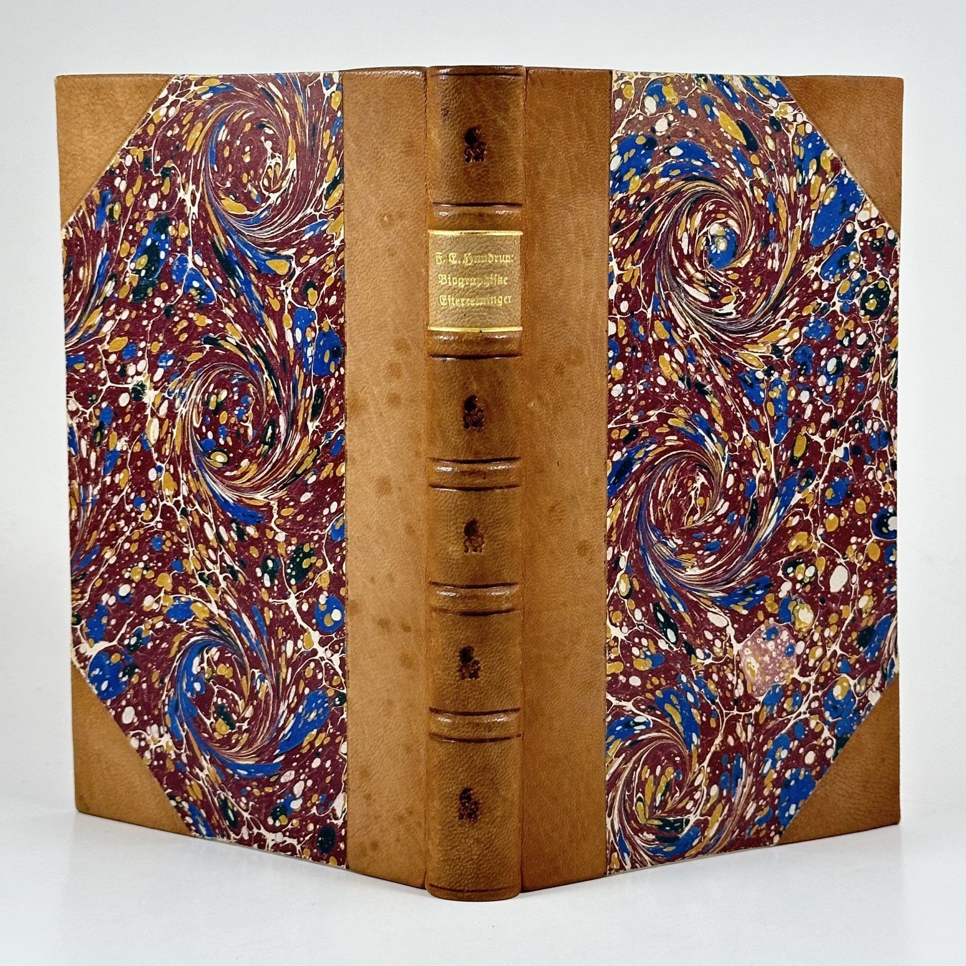 Trykt i J. D. G. Hansons Bogtrykkerie, Roeskilde 1854-59. 295 sider. Indbundne i et senere, elegant halvbind af cognacfarvet gedeskind med bindforhøjninger, blindtrykte vignetter og titel i guld på ryggen. Skindet ganske let småplettet. Ellers velholdt.