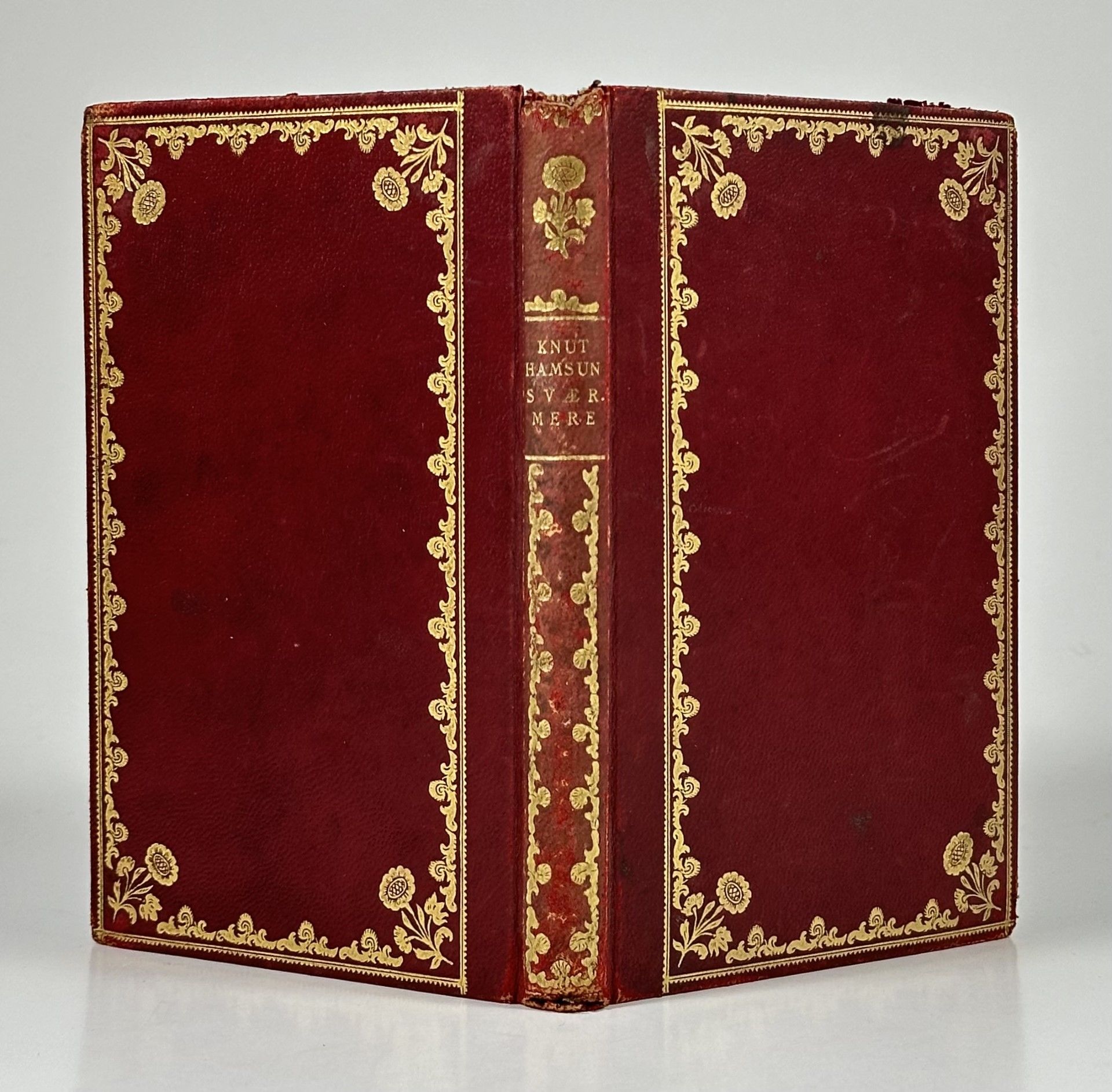 Sjette Oplag. Gyldendal, Kristiania 1922. Lille 8vo. 156 sider. Originalt rødt helbind i skind med guldbordurer på permerne. Tresidet guldsnit. Ryg noget skrammet.