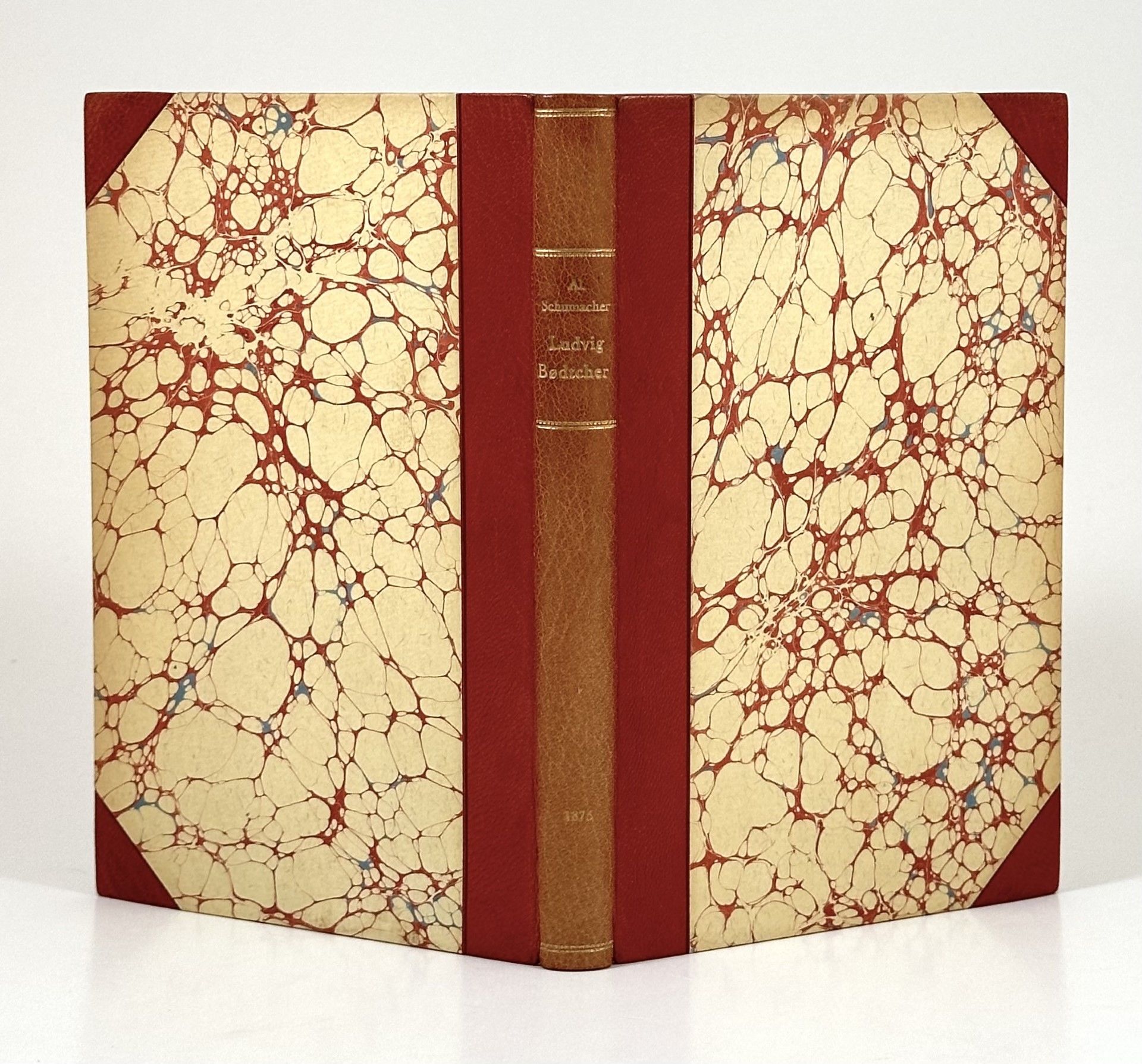 Otto B. Wroblewski's Forlag, København 1875. 149+VI sider. Med træskåret portræt. Indbundet ubeskåret i et smukt halvbind af teglrødt gedeskind med rygforgyldning (Jens E. Hansen). Exlibris. Ryggen meget svagt falmet.