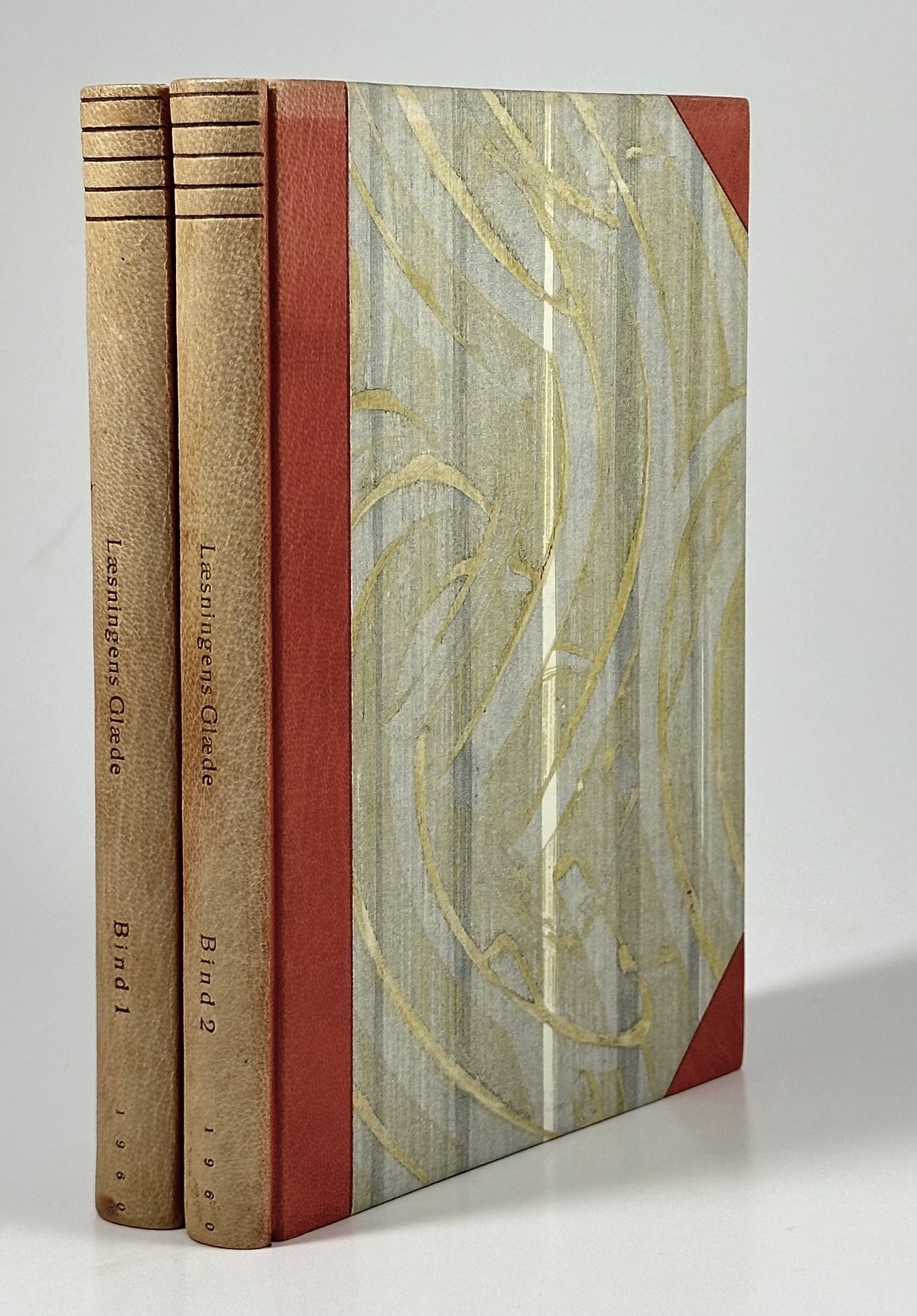 2 bind. Den danske Antikvarboghandlerforening, København 1960. 255 + 235 sider. Indbundet ubeskåret med orig. for- og bagomslag i kønne halvbind af teglrødt gedeskind (Harry Larsen). Rygge falmet.