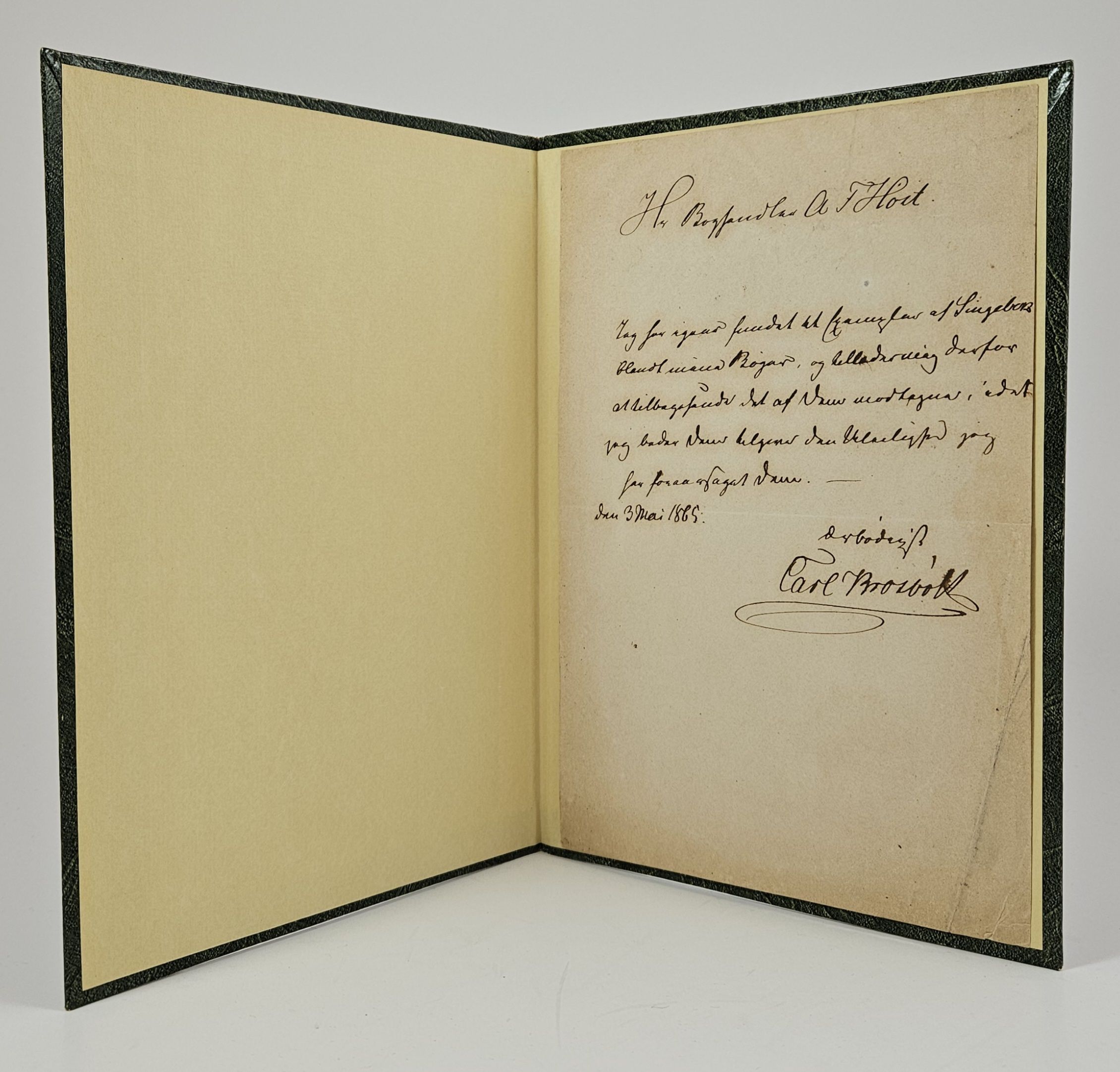 Orig. brev til Boghandler A.F. Høst. 6 linjer, signeret Carl Brosbøll og dateret 3. maj 1865. I et kønt grønmarmoreret papirbind med håndskrevet titelfelt.