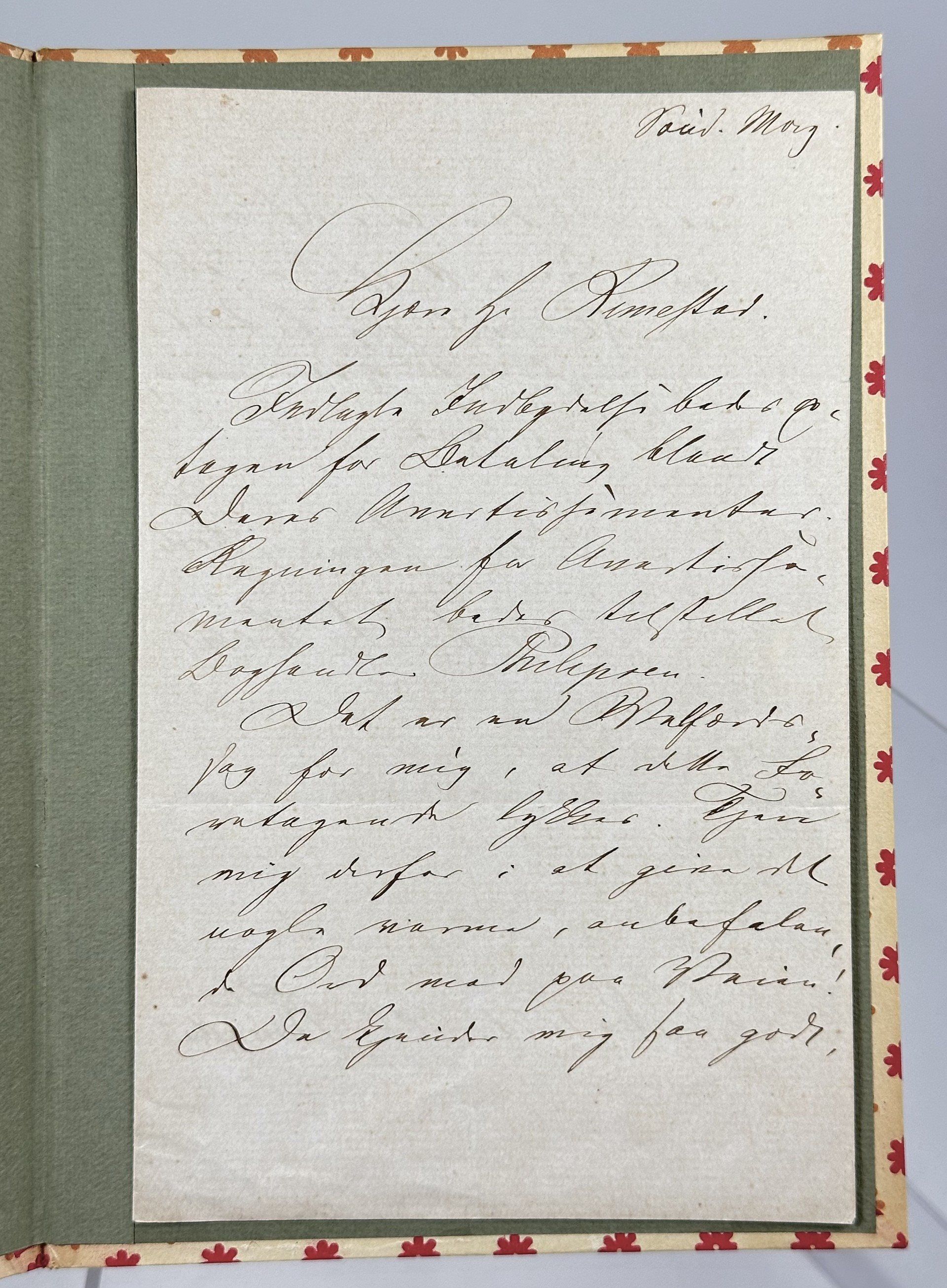 Orig. brev til "Kjære Hr. Rimestad". 18 linjer med underskrift. Udateret, I et kønt marmoreret papirbind med håndskrevet titelfelt.