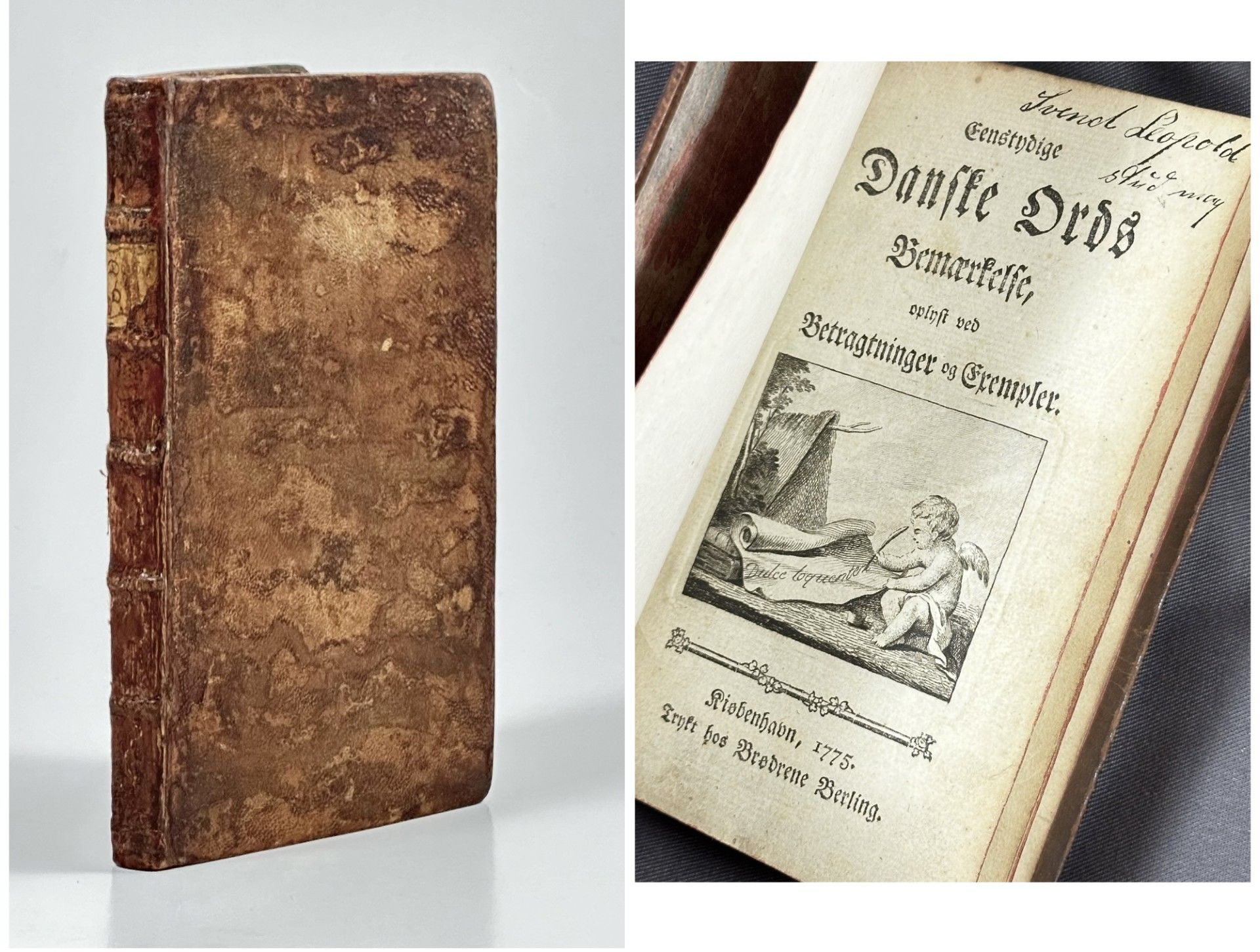Trykt hos Brødrene Berling, København 1775. Lille 8vo. På skrivepapir. (8)+98+(4) sider. Kobberstukket vignet på titelbladet. Samt. helbind af brunmarmoreret kalveskind. Navn (Svend Leopold, Stud. mag.) øverst på titelbladet. Udvendige false slidt.