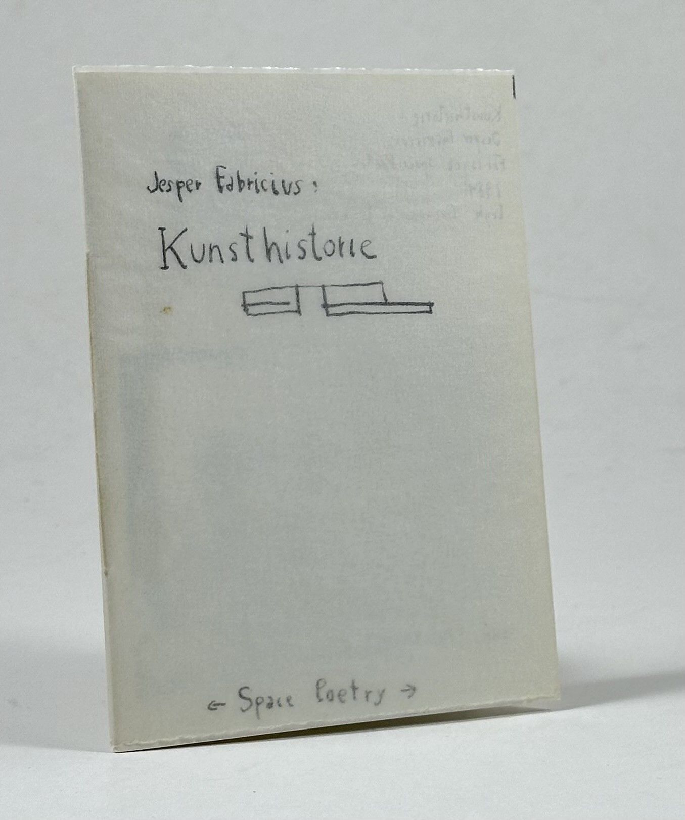 Space Poetry, København 1989. Lille 12mo. Upagineret (ca. 16 sider). Illustreret i s/h af kunstneren selv. Orig. omslag med pergament smudssomslag. Smudsomslaget en anelse plettet, ellers meget fint og velholdt eksemplar.