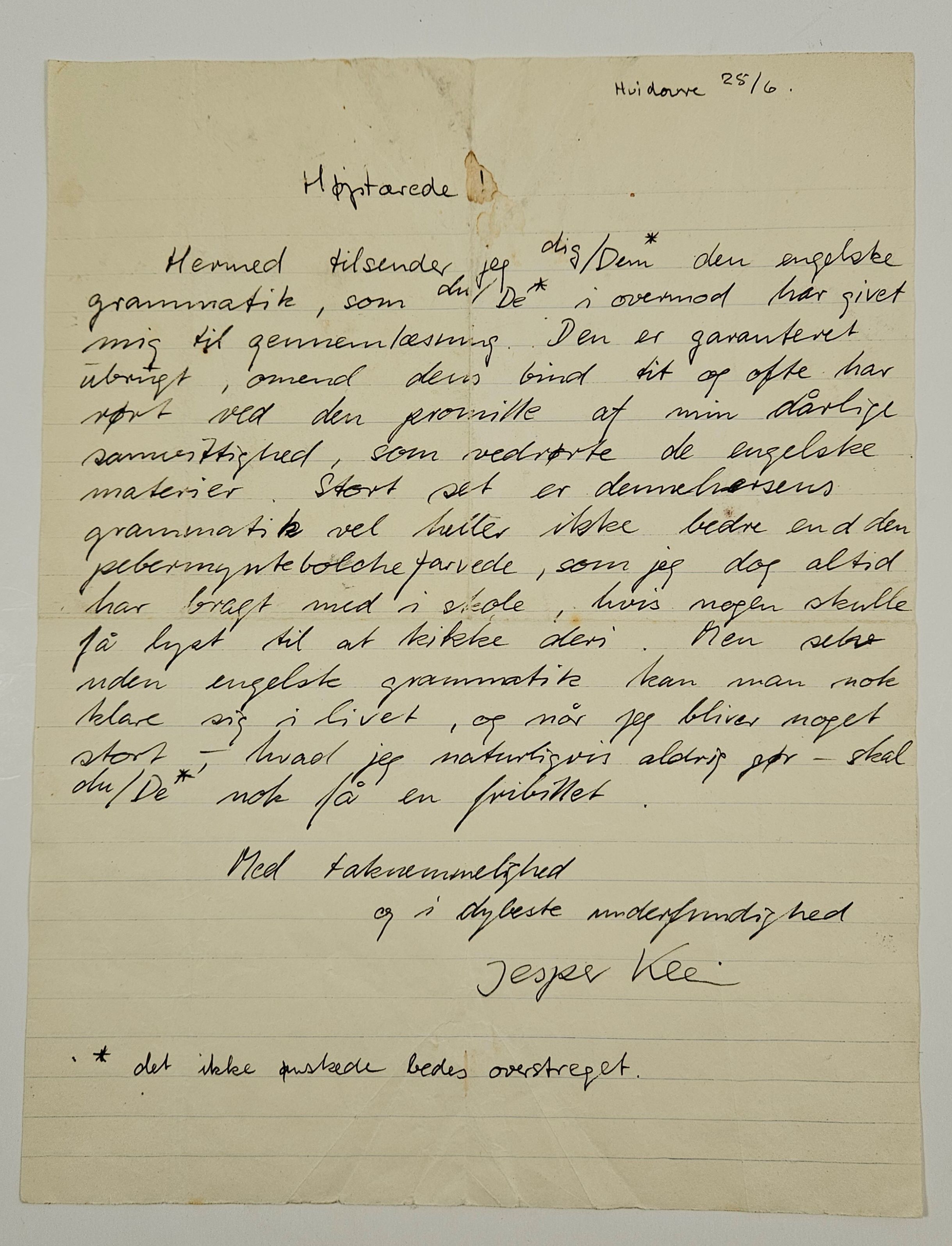 * Den senere så folkekære skuespiller Jesper Klein (1944-2001) returnerer med yderst velformuleret underfundighed en engelsk grammatik til sin lærer på Rødovre Statsskole, hvor han blev student i 1963.: "Men selv uden engelsk grammatik kan man klare sig i livet, og når jeg bliver noget stort - hvad jeg naturligvis aldrig gør - skal du/De nok få en friblllet".