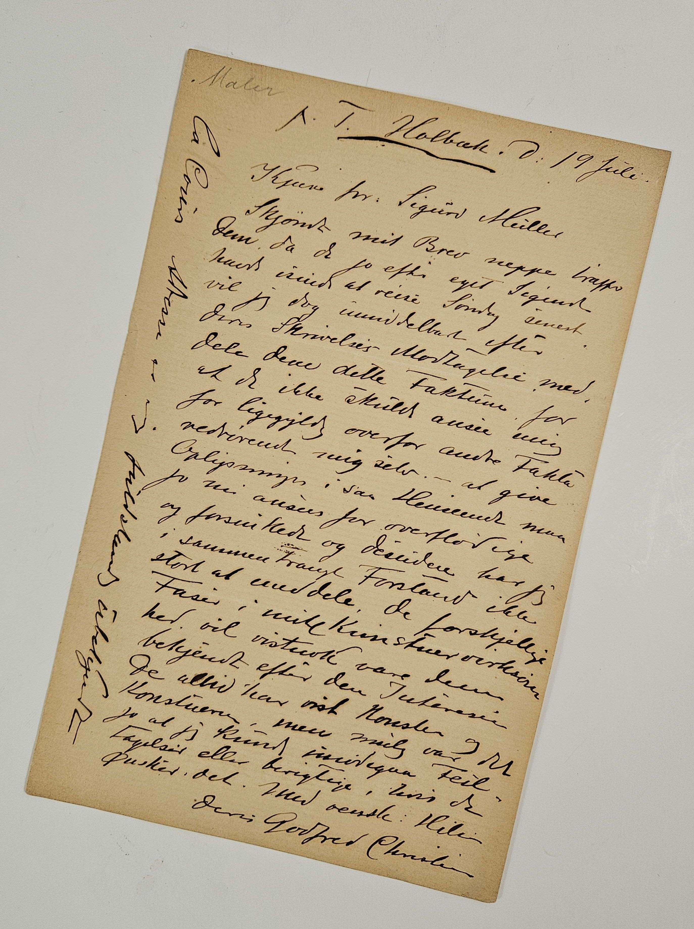 Lille ark [21 x 14 cm]. Dateret Holbæk 19. juli [c. 1880?], Stilet til kunsthistorikeren Sigurd Müller. 23 linjer, signeret "Deres Godfred Christensen".
