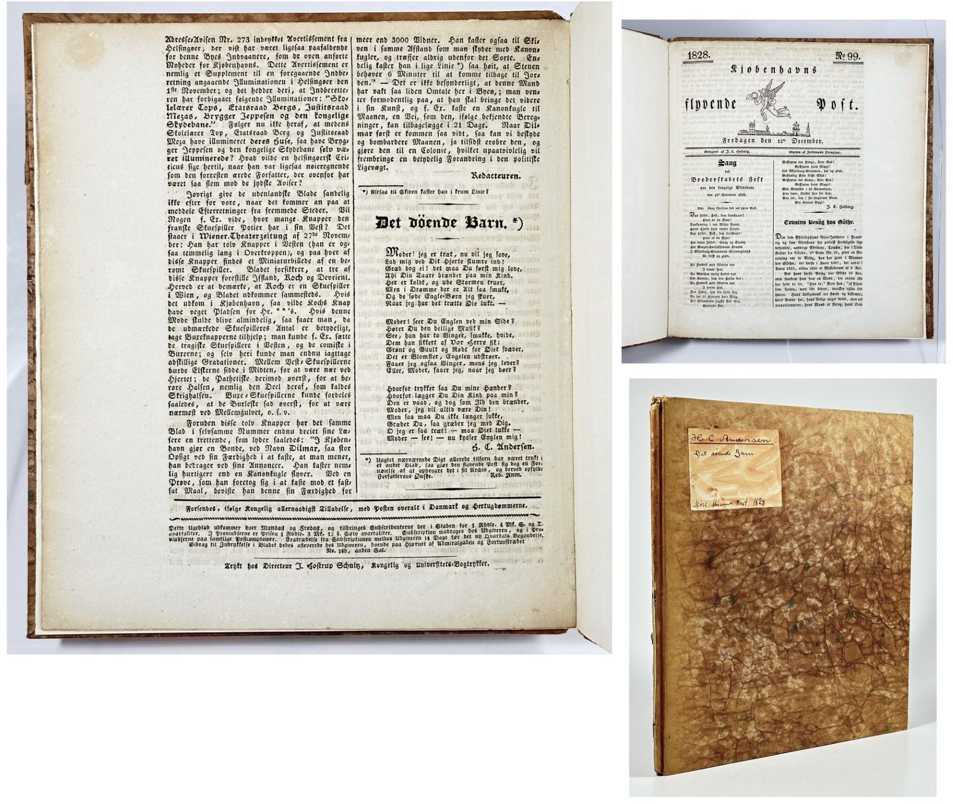 Kjøbenhavns flyvende Post 1828. Redigeret af Johan Ludvig Heiberg. Trykt hos Jens Hostrup Schultz, København 1828. Nummer 99. Senere papirbind med håndskrevet titelfelt på forpermen. Exlibris (Hjalmar Hartmann). Ryggen beskadiget,