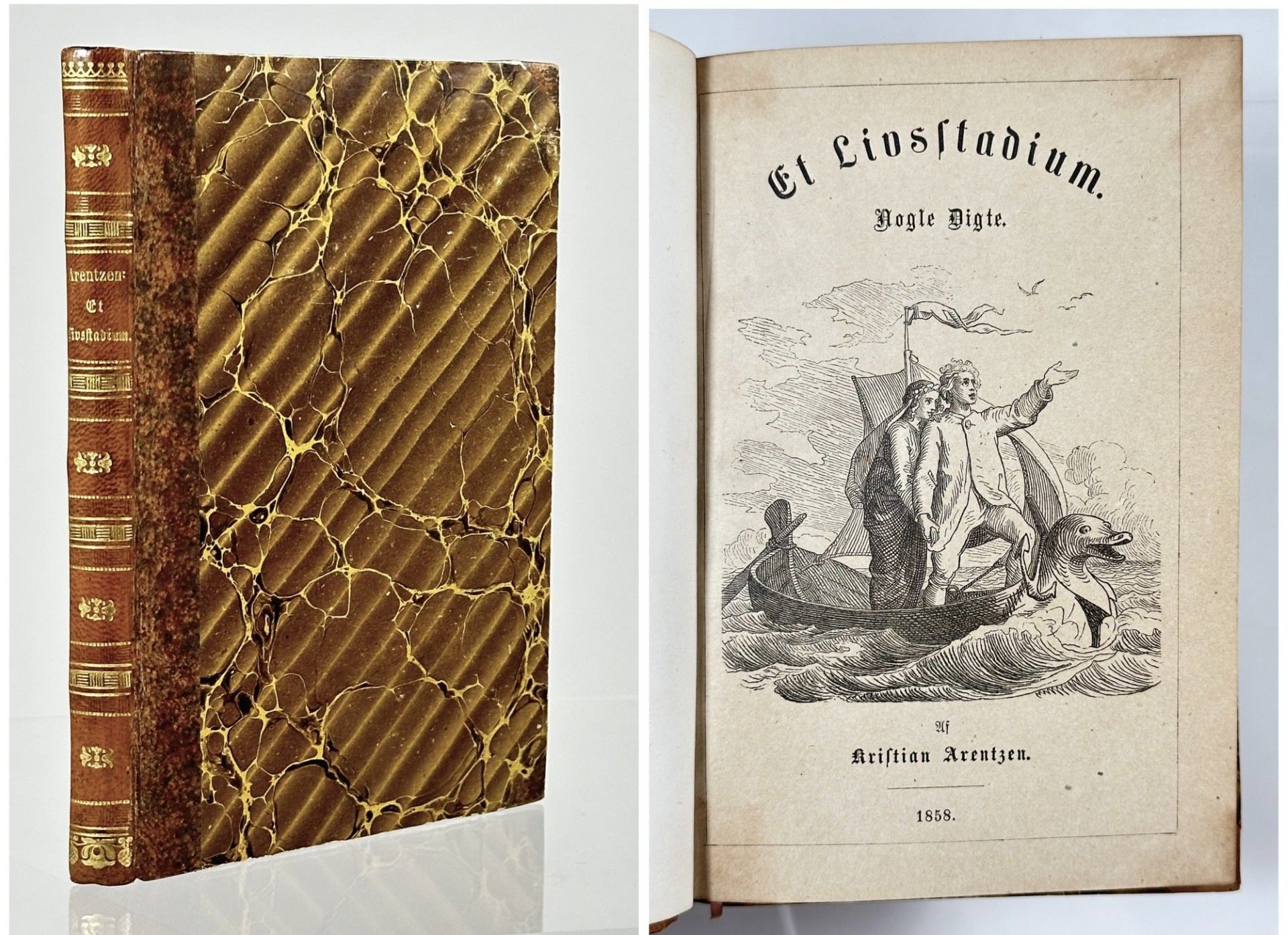 Chr. Steen og Søn, København 1858. (4)+148 sider. Indbundet med originalt omslag i et smukt, samtidigt halvbind af kalveskind med rig rygforgyldning. Bindet er udført af Wilh. Gether. Helt rent eksemplar.