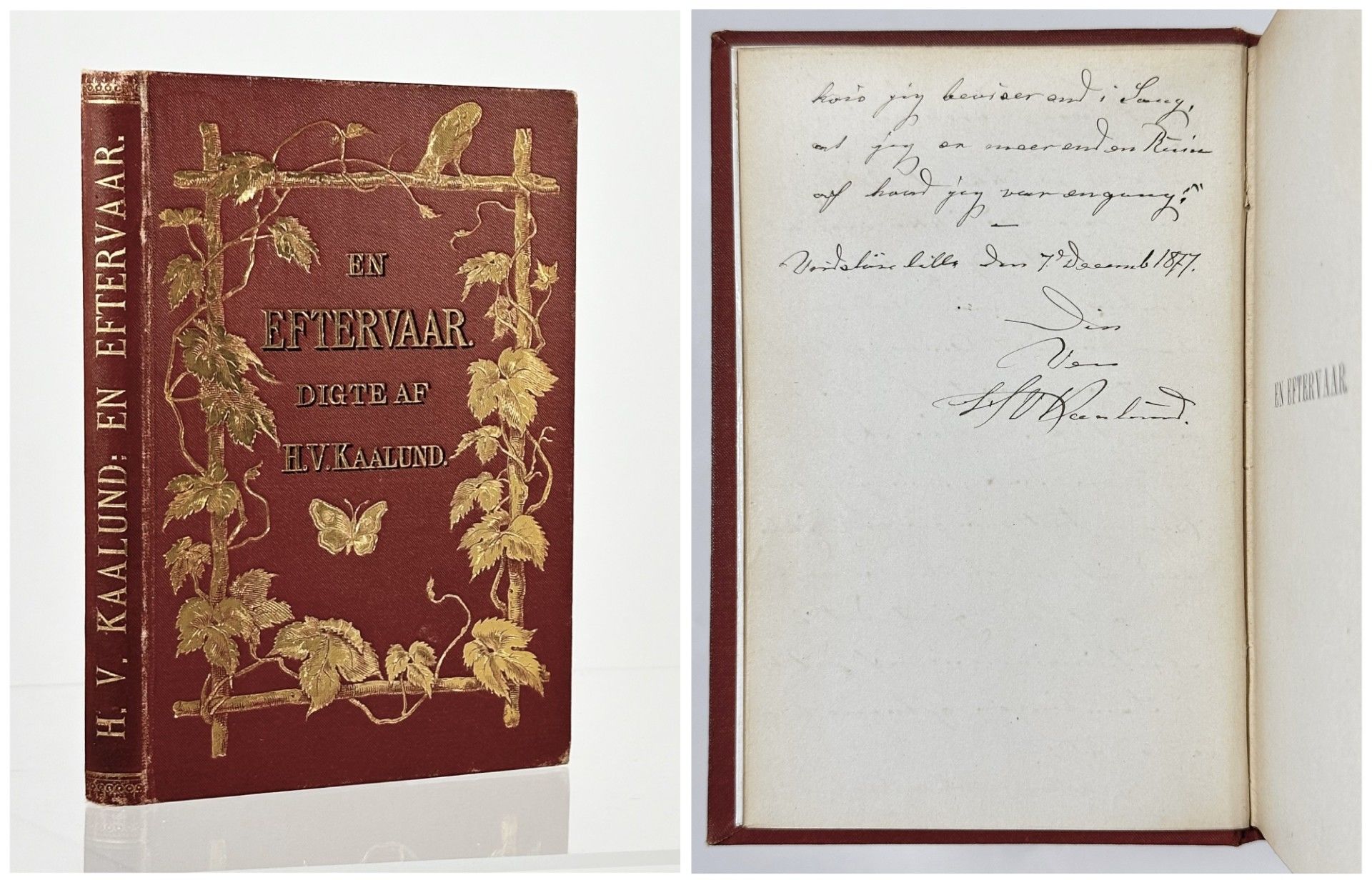 Gyldendal, København 1877. 142 sider. Orig. brunt komponeret helshirtingsbind med rig gulddekoration og tresidet guldsnit. Begge indvendige false svage.