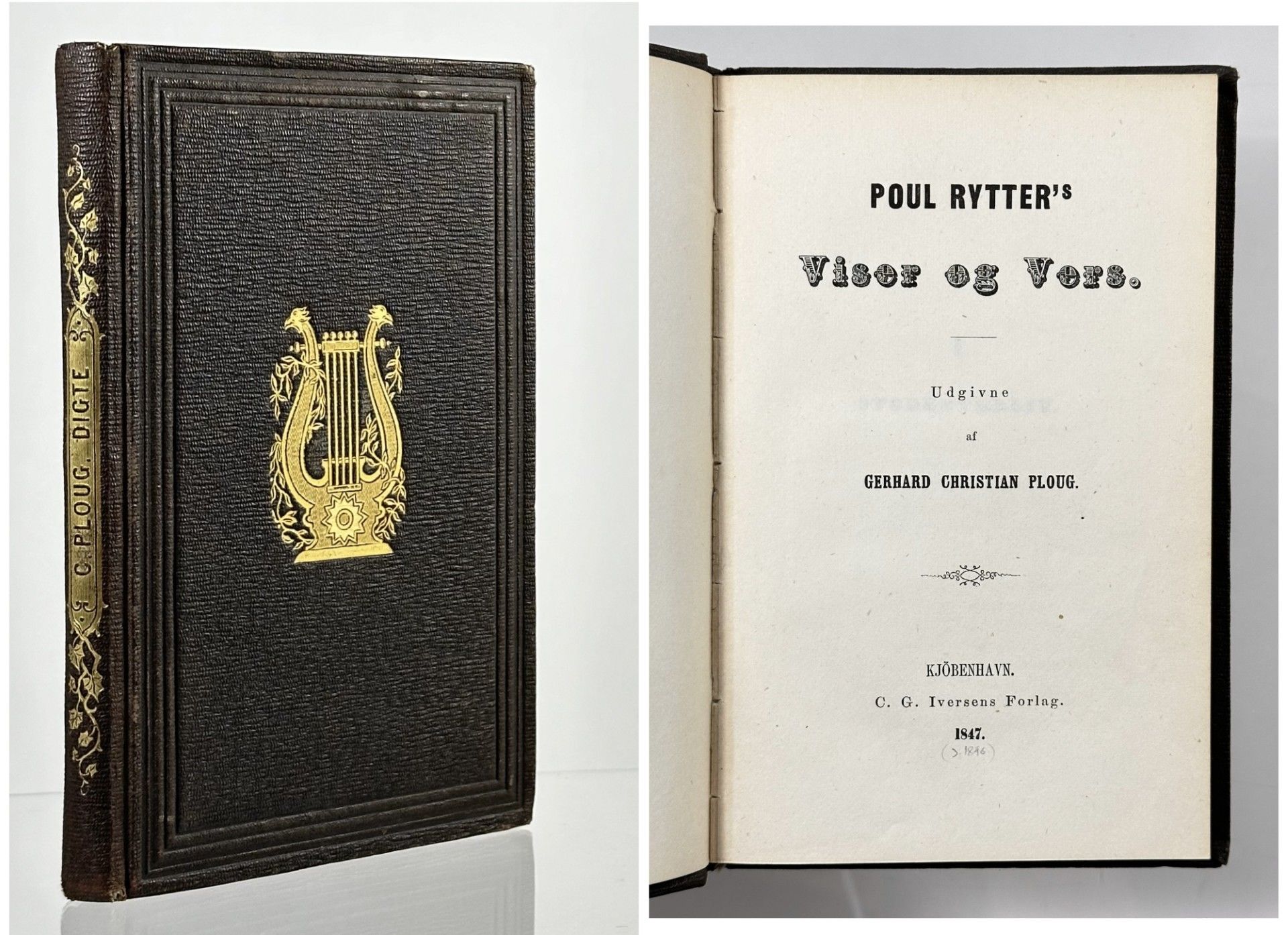 C.G. Iversens Forlag, København 1847. 186 sider. Samtidigt sort komponeret helshirtingsbind med dekorationer i guld og blindpræg samt forgyldt rygdekoration indeholdende titlen "C. Ploug. Digte" (C. Schmidt).