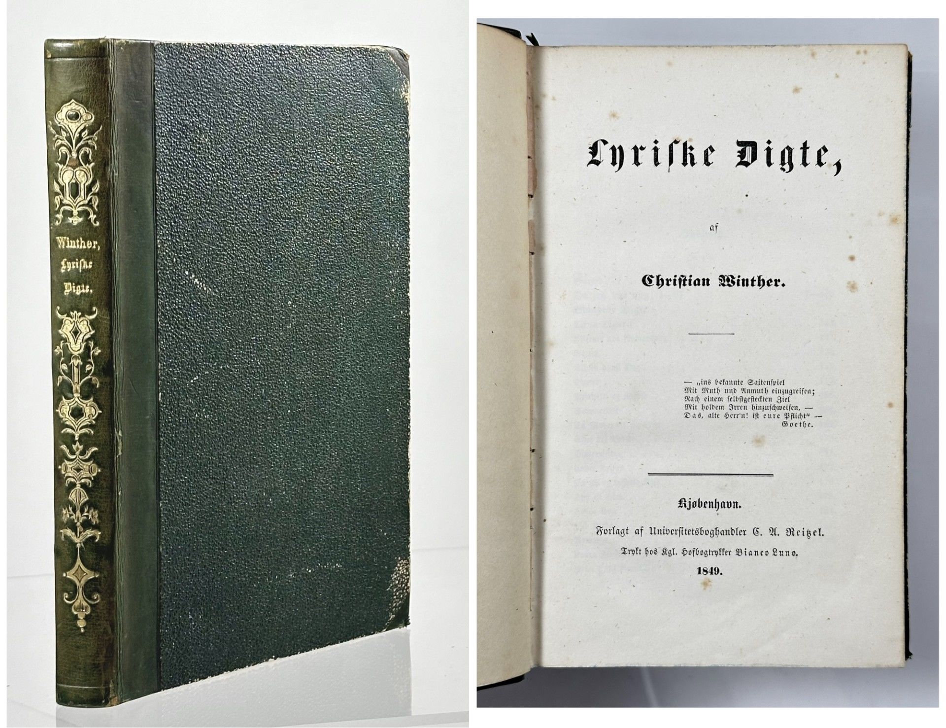 C.A. Reitzels Forlag, København 1849. 212 sider. Smukt samtidigt halvbind af grågrønt kalveskind med rig, tidstypisk rygforgyldning.