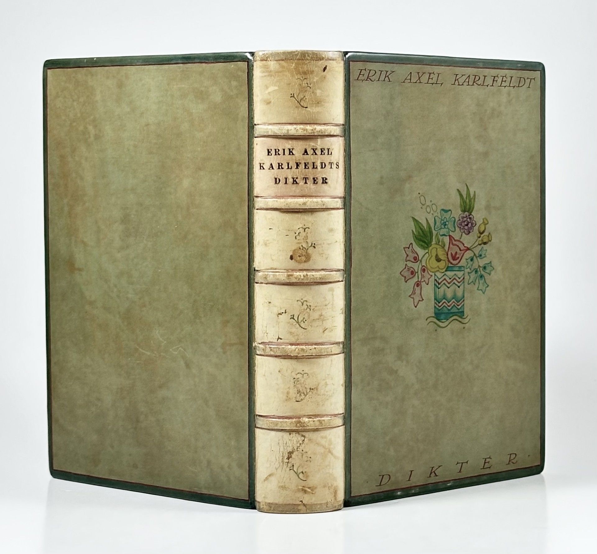 Wahlström & Widstrand, Stockholm 1943. 434 sider. Indbundet med originalt foromslag i et lakeret helbind af lyst kalveskind; forperm og ryg håndmalet med blomsterdkorationer. Indvendig malet bordure. Tresidet guldsnit. Bindet signeret "Nordiska Bokhandlns Bokbinderi, Stockholm". I nydelig kassette.