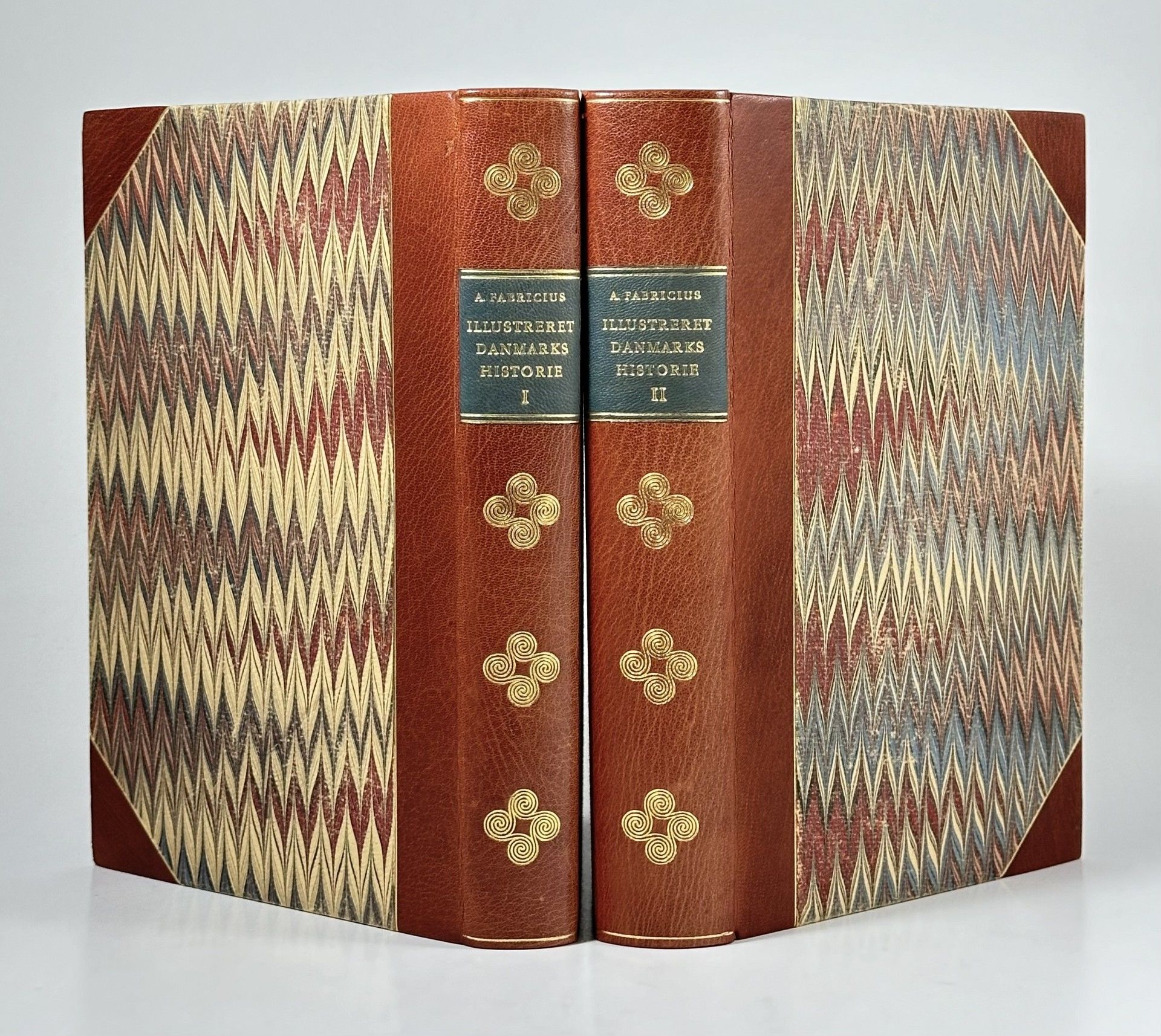 2 bind. Gyldendal, København 1914-15. 4. udgave. Revideret og forøget ved Knud Fabricius. 543 + 687 sider + udfoldelige farveplancher. Smukke halvbind af teglrødt gedeskind med rig rygforgyldning (spiralornamenter i bronzealderstil) og med rygtitelfelt af blågråt maroquin (Henning Jensen, ikke signeret).