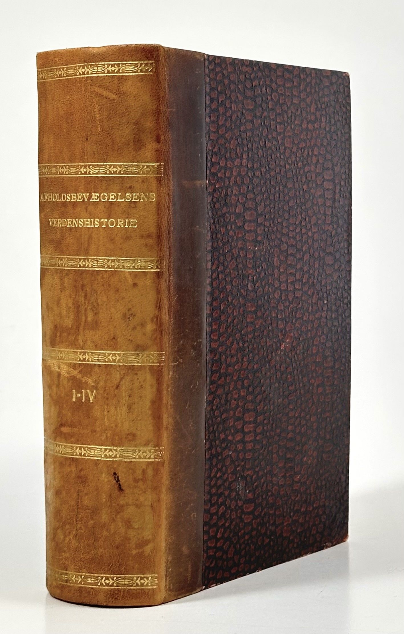 4 dele i 1 bind. Danmarks Afholds-Biblioteks Forlag, København 1911-14. 8vo. 208+(6)+218+(6)+240+(8)+(4)+432+(12) sider. Illustrationer i s/h. Kønt samtidigt halvbind af brunt kalveskind med rygforgyldning og med indsnit efter værkets opdeling på forsnittet. Ryggen falmet.