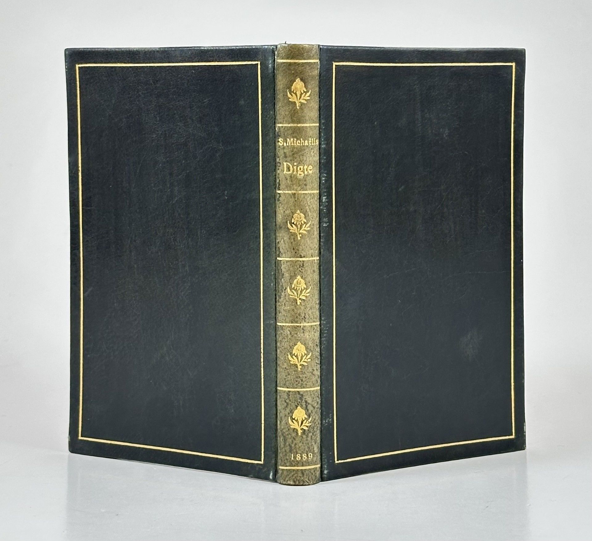 P. Hauberg & Comp., København 1889. Lille 8vo. (8)+149 sider. Indbundet med orig. omslag i et kønt samtidigt helbind af poleret sortgrønt maroquin med guldtrykt dekoration. Exlibris (Harald Pedersen). Ryggen let falmet.