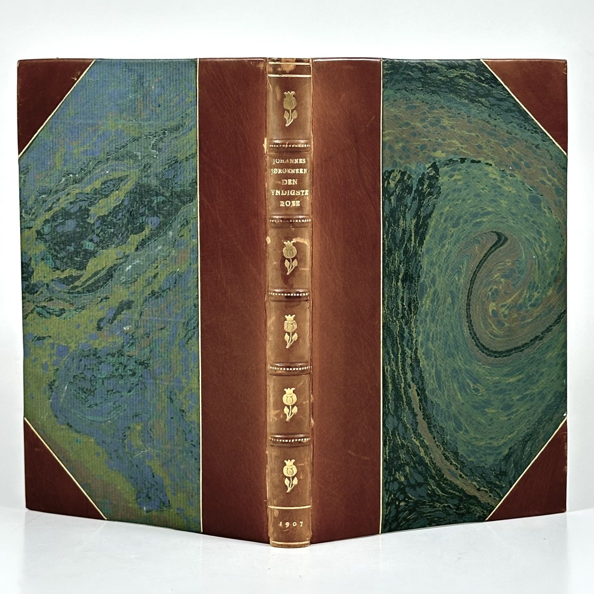 Gyldendal, København 1907. 136 sider. Indbundet ubeskåret med orig. omslag i et smukt halvbind af brunt gedeskind med rig rygforgyldning og topguldsnit (Jakob Baden).