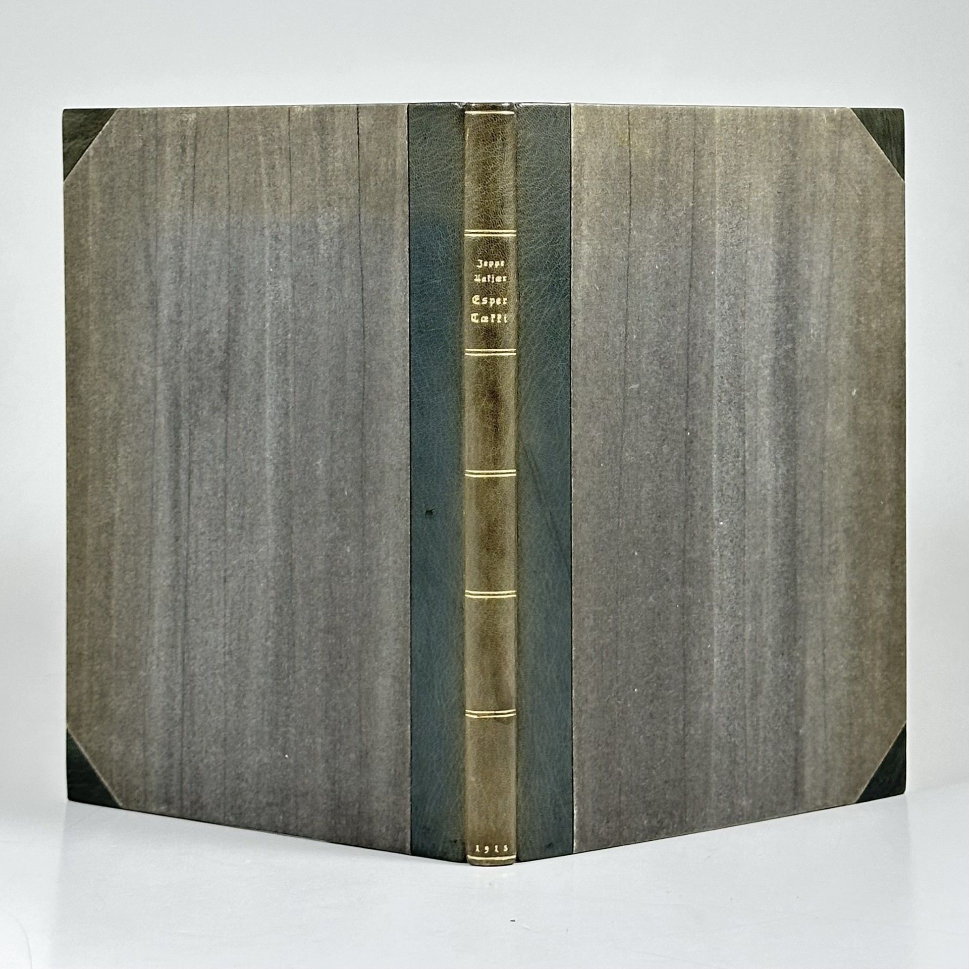 Gyldendal, København 1913. 1. oplag. 59 sider. Indbundet ubeskåret med originalt omslag samt rygstribe i et elegant halvbind af grønt gedeskind, udfært af Birgit Kryger Larsen. Exlibris [Harald Pedersen].