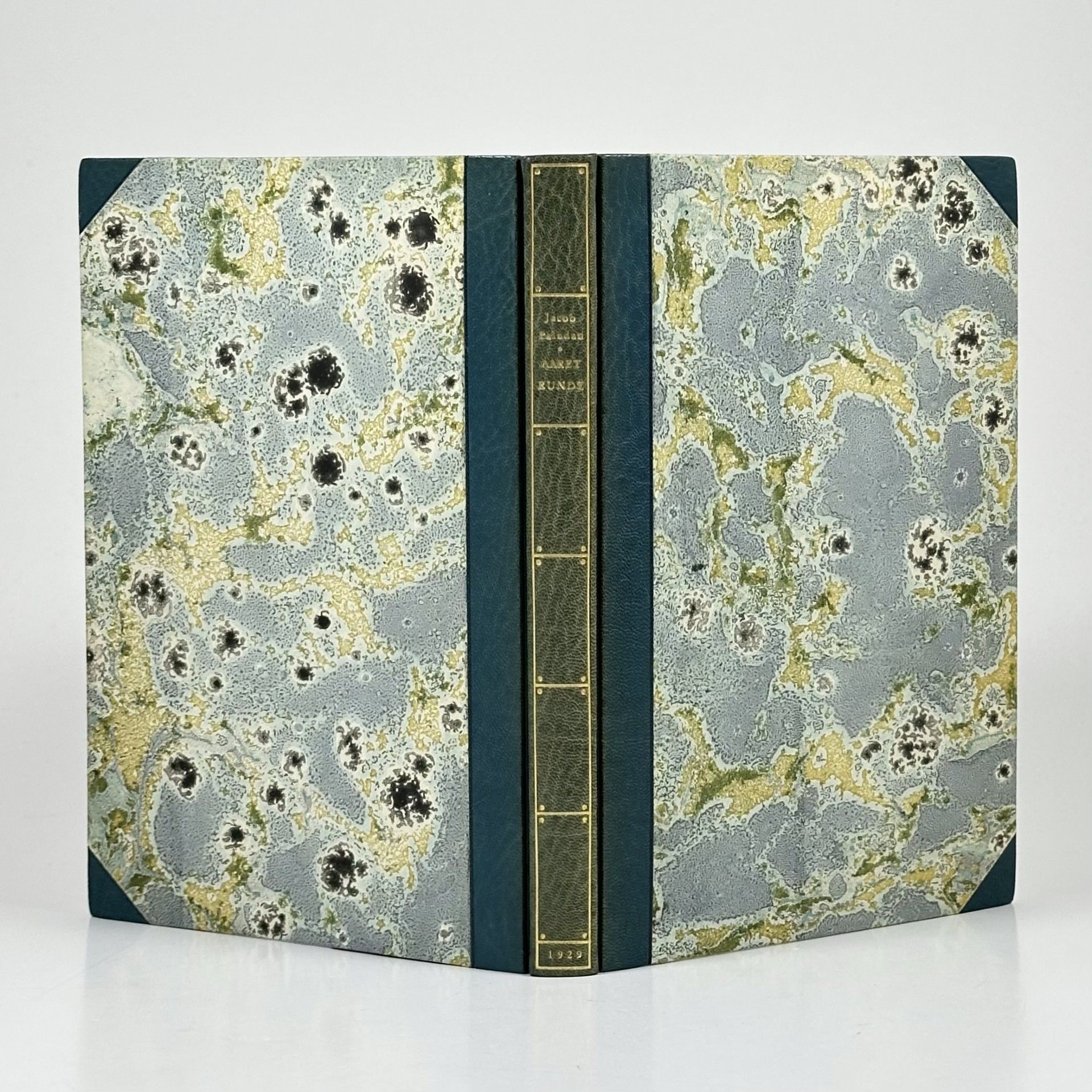Steen Hasselbalchs Forlag, København 1929. 1. udgave. 147 sider. Indbundet ubeskåret med orig. omslag og rygstribe i et smukt halvbind af blåt maroquin med stregforgyldning på ryggen (Juul-Lassen). Exlibris (Harald Pedersen). Ryggen let falmet.