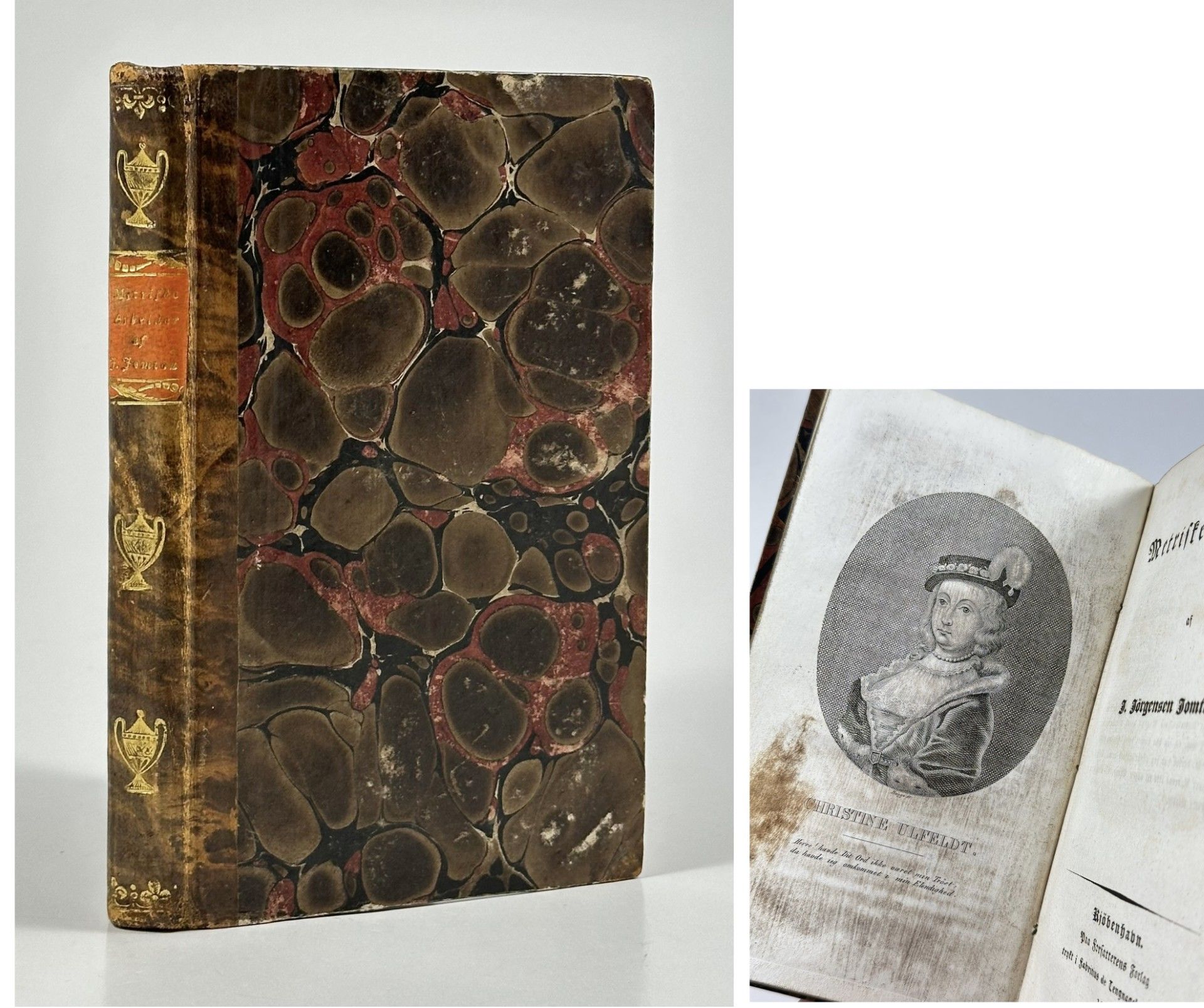 Paa Forfatterens Forlag, København 1827. 8vo. (4)+187+(1) sider. Med kobberstukket portræt af Leonora Christina Ulfeldt som frontespice. Samtidigt halvbind af brunmaroreret kalveskind med rig rygforgyldning. Portrætplanchen plettet.