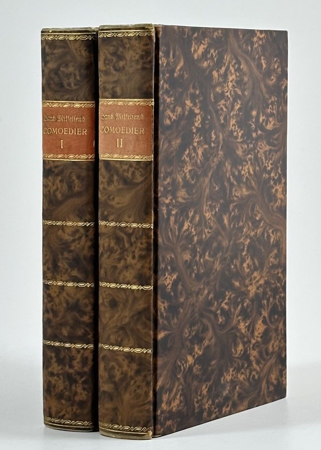 2 bind. Gyldendal, København 1902. Upagineret. Indbundet ubeskåret med orig. foromslag i 2 smukke uniforme brunmarmorerede papirbind med enkel rygforgyldning og pergamentforstærkede kapitæler. Exlibris (Frits Johansen).