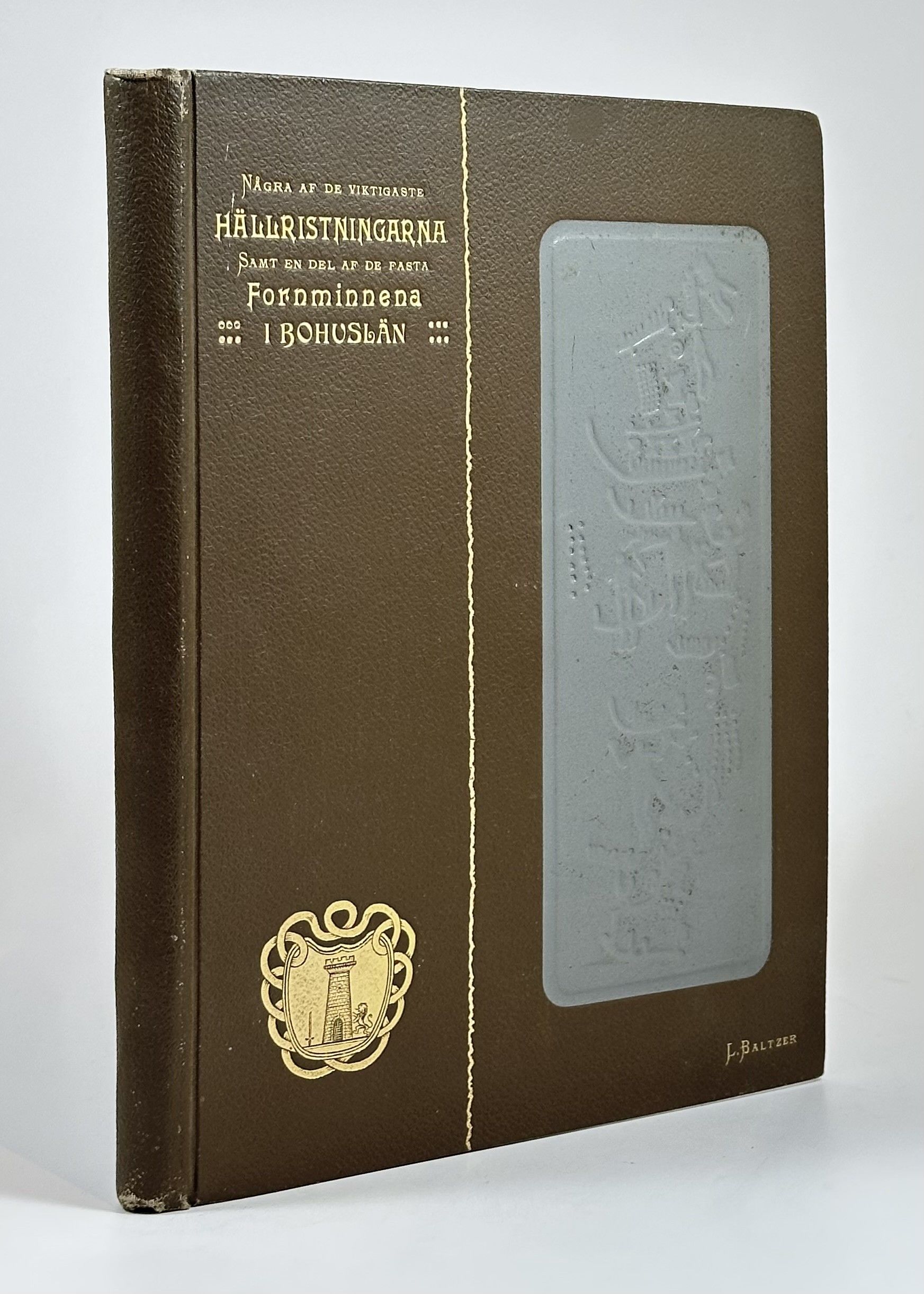 Göteborg 1911. Stor 8vo. 39+(1) sider. Med LXIV illustrationsplancher. Orig. hellærredsbind med stor blindtrykt helleristnings-illustration og Baahus Lens våben i guldtryk på forpermen.