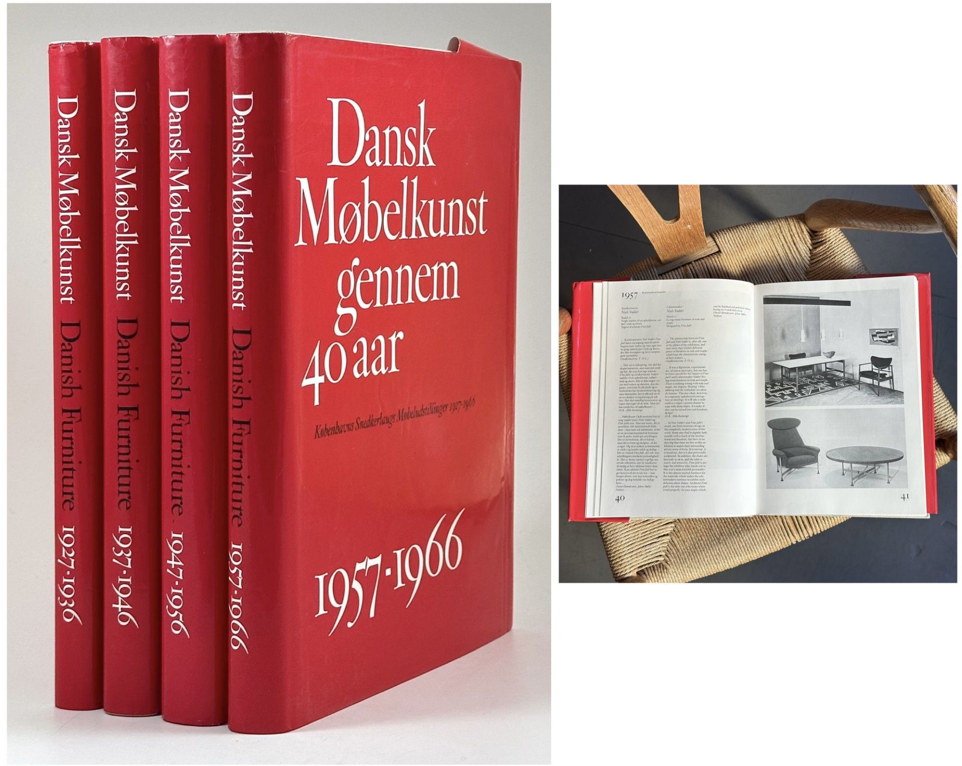 4 bind/volumes. Teknologisk Instituts Forlag, København 1987. 4to. 363 pages. Illustreret med fotos i s/h/Illustrated with photos in b/w. Orig. hellærredsbind med smudsomslag/Publisher's cloth in dust wrappers. Stamps to the halftitles. Første bind med orange indstregninger på det første par sider af introduktionen samt blyantsnoter på det første par sider af listen over snedkermestre/First volume with highlighter to two pages of the introduction and notes in pencil to two pages of the list of cabinetmakers. Near fine/near fine- wrappers. * Danish/English parallel text. The authoritative, richly illustrated reference work on 20th century Danish furniture.