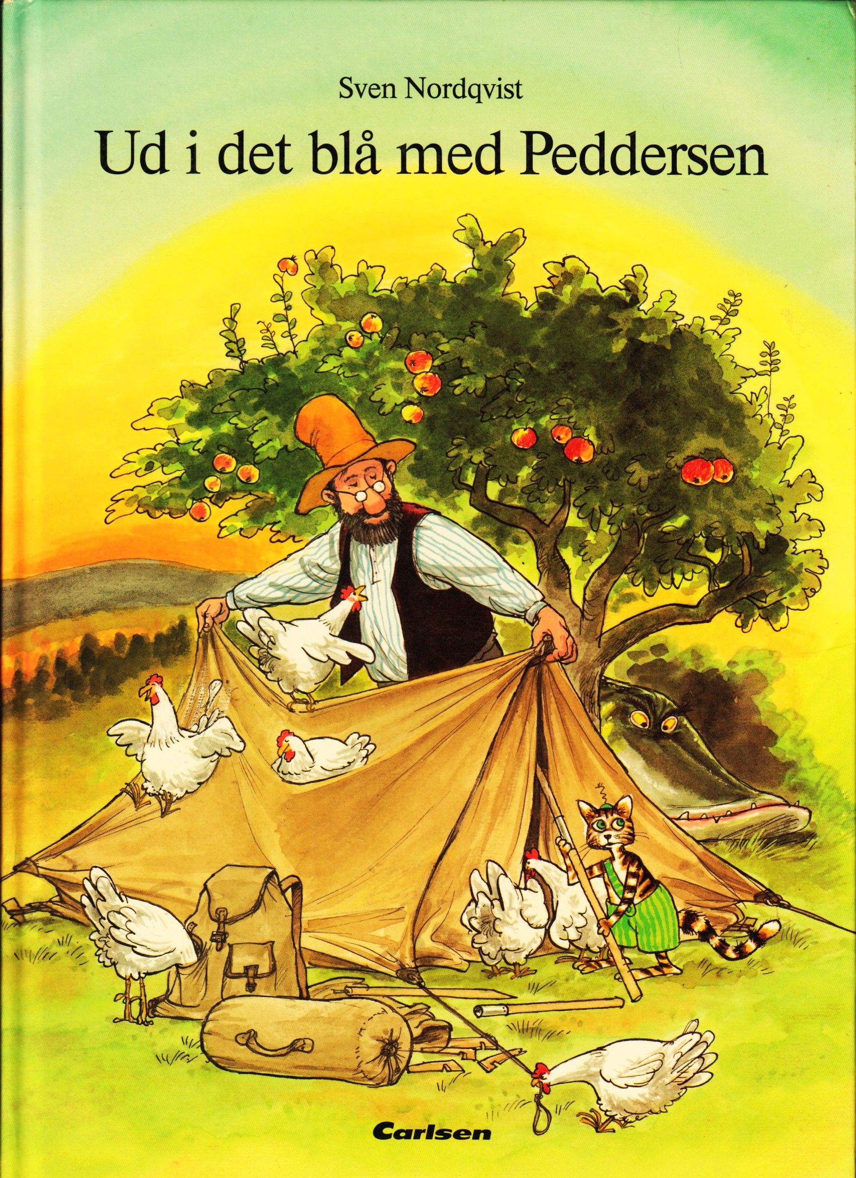 Ud i det blå med Peddersen. Pænt og rent eks. Billedbog. Katten Findus finder Peddersens gamle telt på loftet, og de to venner tager på telttur. Men da hønsene også vil med, kommer de ikke så langt. Peddersen når dog at prøve sin nye opfindelse: en flitsbue-fiskestang. Tegnet og fortalt af Sven Nordqvist. På dansk ved Arthur Krasilnikoff