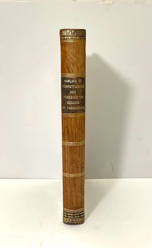 Stockholm, P. A. Norstedt & söner, 1892. 8:o. VIII,+ 438 s. Liten fuktrand i nedre hörn inledningsvis och mot slutet. Samtida ljubrunt hfrbd, något flammig guldornerad rygg med svart titeletikett, marmorerade snitt. Ryggen med stänk. Sannolikt ur Viktor Almquists bibliotek. Tilllägg utkom 1864 och 1898. Johan Henrik Nilsson var kamrerare i Kungl. Fångvårdsstyrelsen, och blev 1915 direktör för Långholmen. Wieselgren inleder sin historik över Sveriges fängelser och fångvård (1895) med att konstatera att ”... den samling af svenska fångvården rörande författningar, som i enlighet med k. brefvet den 20 maj 1887 efter kungl. fångvårdsstyrelsens uppdrag blifvit af dess kamrerare, herr J. H. Nilsson, så förtjänstfullt utarbetad, har en inom denna förvaltningsgren förut mycket kännbar brist blifvit fylld. Men då med detta arbete klargjorts blott de nutida förhållandena inom fångvården, har ännu något återstått att belysa”. Gustaf Fridolf Almquist (1814-86) var jurist och ämbetsman, halvbror till Carl Jonas Love Almquist. Han utnämndes 1863 till underståthållare i Stockholm men blev framförallt generaldirektör för Fångvårdsstyrelsen år 1867. Som chef för fångvården jobbade han för ett förbättrat fängelsesystem, med inrättande av nattceller och arbetslokaler samt ordnad skolundervisning vid centralfängelserna. Han utgav i samband med den stora ”penitentiarkongressen” i London 1872 boken ”A perçu sur la législation pénale et les établissements pénitentiaires en Suède”. ”Det kan sägas, att Almquist på sin tid var en av de främsta ledarna bland Europas fångvårdsmän. Han låg i oavbruten korrespondens med de olika ländernas straffrättslärde och fängelsechefer, vilka gärna inhämtade hans anvisningar och råd, då det gällde reformers genomförande och nya anstalters anläggande” (Bertil Boëthius i SBL). Han var dock även verksam inom olika föreningar för stöd till ”värnlösa och fallna” och åkerbrukskolonien Hall, en förbättringsanstalt för ”vanartiga barn”, vilket blivit den nuvarande Hallanstalten. Hans son Victor Almquist blev likaledes överdirektör för den svenska fångvården och fortsatte arbetet med förbättrandet av fångarnas villkor.