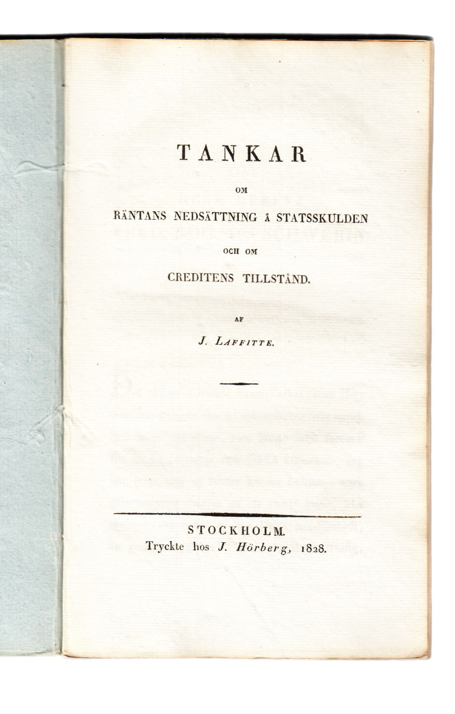 Stockholm, tryckte hos J. Hörberg, 1828. 8:o. 135 s. Samtida marmorerat pappband. Med förord av den svenska översättaren Carl David Skogman (1786-1856) dedicerat till Fred. Bog. von Schwerin. Översättning av det franska originalet ”Réflexions sur la réduction de la rente et sur l'état du crédit”. Jacques Laffitte (1767-1844) var en förmögen fransk bankir och statsman, och åren 1814-20 chef för franska nationalbanken. Han var en av de liberala ledarna under Julirevolutionen 1830 och blev under kung Ludvig Filip konseljpresident men var för liberal för kungen och fick avgå redan 1831. Laffitte var mycket populär och då han genom en börskrasch förlorade hela sin förmögenhet och sitt fina hus i Paris ordnades en nationalsubskription så att han skulle kunna bo kvar.