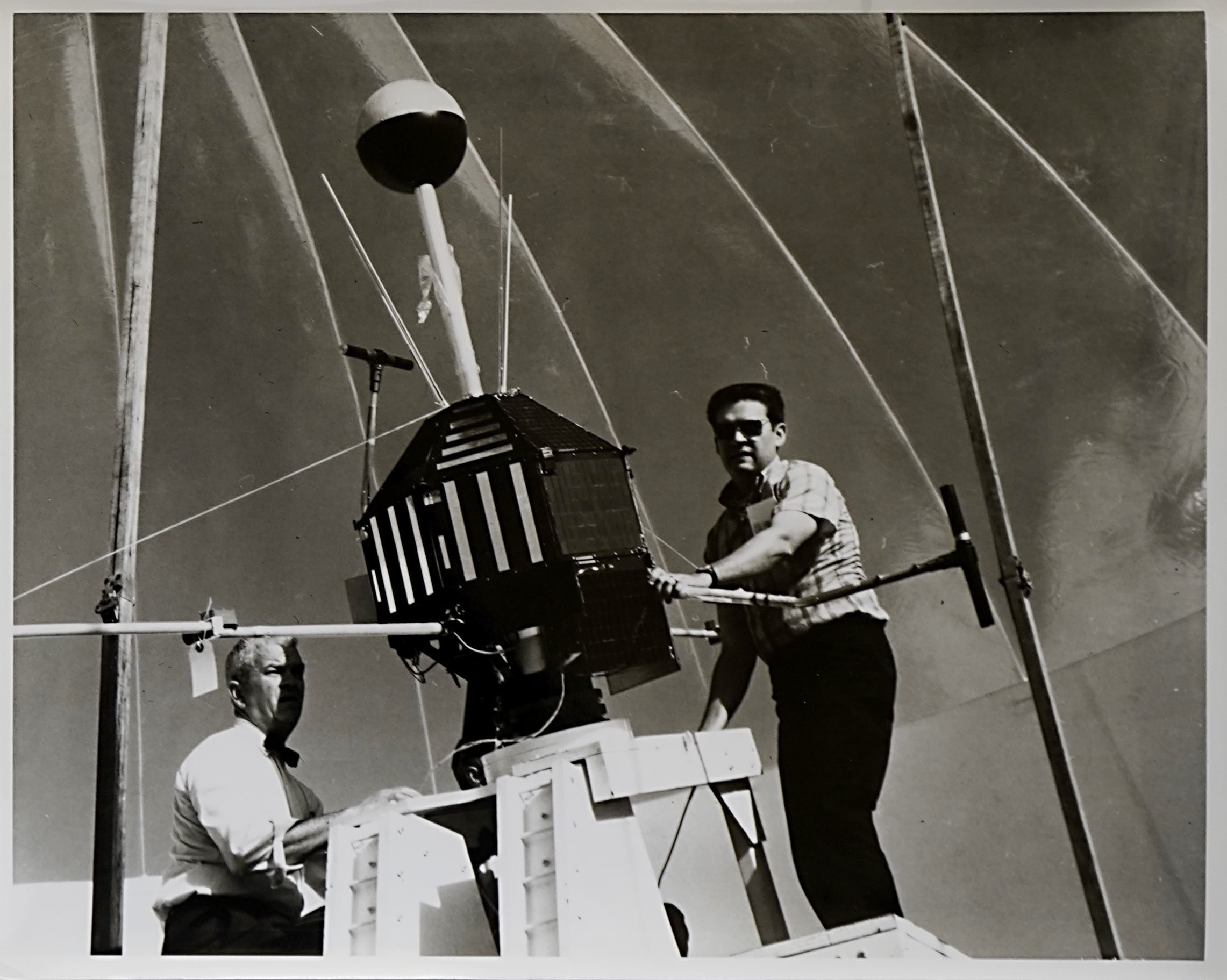 Washington, NASA, 1970-71. 3 glossy black and white photographs (ca 254 x 203 mm) with blue carbon copied text on reverses. NASA nrs 71-H-1650, 71-H-1652, 71-H-1648, Two of the photos depict technicians working with the satellite before launch, while the third shows an artist’s concept of the spacecraft in orbit. Explorer 45, as it eventually was called, became the only spacecraft that was built in NASA’s Small Scientific Satellite program. It was designed to perform studies in the magnetosphere using multiple instruments and launched on 15 November 1971 from the Broglio Space Center in Kenya. After having operated successfully for three years it was turned off on 30 September 1974.