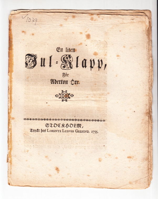 Stockholm, Lorentz Ludvig Grefing, 1755. 4:o. (16) s. Häftad och oskuren. Itu i ryggen. Fläckig och med genomgående fuktrand. En ny utgåva utgavs 1787 med titeln ”En liten jul-klapp, för två schillingar”, även den anonym. En något irrande humoristisk utläggning om bland annat julklappar, med insprängda verser.