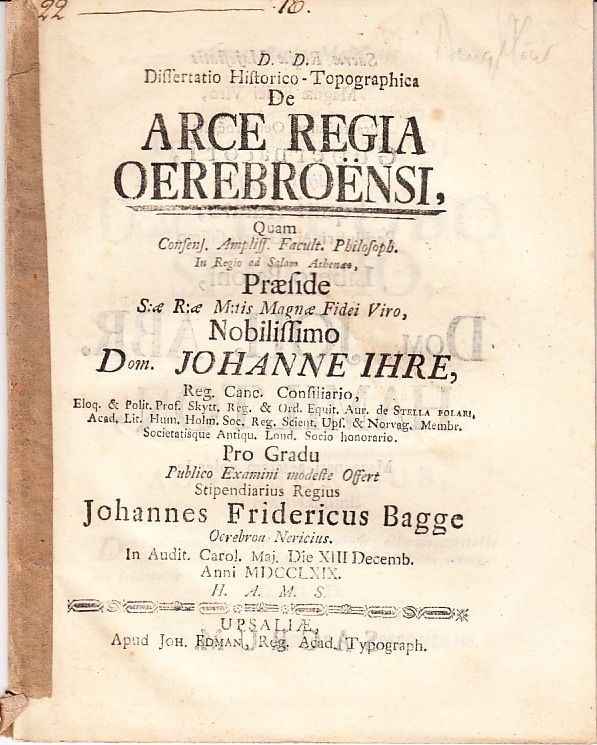 Uppsala, Joh. Edman, 1769. 4:o. (4),+ 25,+ (1) s. Senare marmorerat pappersomslag. Med breda marginaler. Enstaka fläckar. Lidén I, 278. Den äldsta avhandlingen om Örebro slott. Bagge är annars mest känd för sin stora Örebromonografi som kom ut 1785.