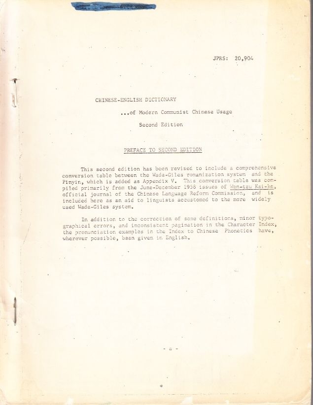 (Washington), Joint Publications Research Service, (1968?). 4to. (8),+ 845,+ (1) pp. Photocopied from typescript. Erased owner’s signature on the title page. Stapled. (JPRS: 20,904.) ”This dictionary is a conversion into English of the Chinesese-Deutsches Worterbuch (Han-Te Tz’u-tien= and was prepared to fill an existing void in the current re ference material on modern Communist Chinese usage in the political, economi, cultrual and technological fields, as well as in the system of abbreviated Chinese characters”.