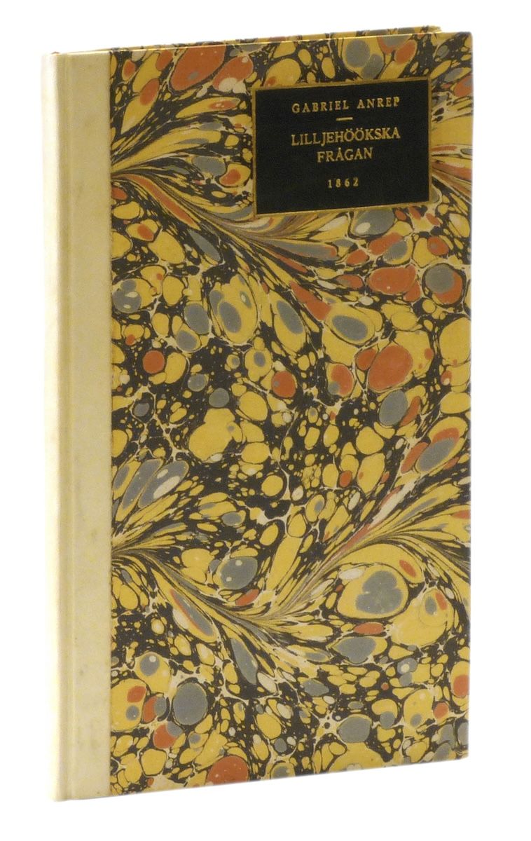 Stockholm, Typografiska föreningens boktryckeri, 1862. 36 s. Senare halvpergamentband med marmorerade pärmpapper, frampärmen med svart titeletikett, putsade snitt och med det tryckta gula originalomslaget medbundet Almquist 300. Fint exemplar av denna skildring av och publicerande av dokument rörande bråket inom Ridderskapet och Adeln huruvida ätten Lilljehöök af Fårdala kan anses utgången eller inte.