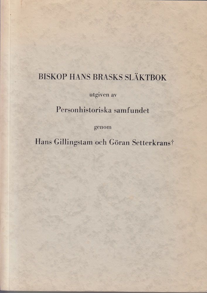Biskop Hans Brasks släktbok utgiven av Personhistoriska samfundet genom Hans Gillingstam och Göran Setterkrans†. Illustrerad med släkttavlor och vapen.