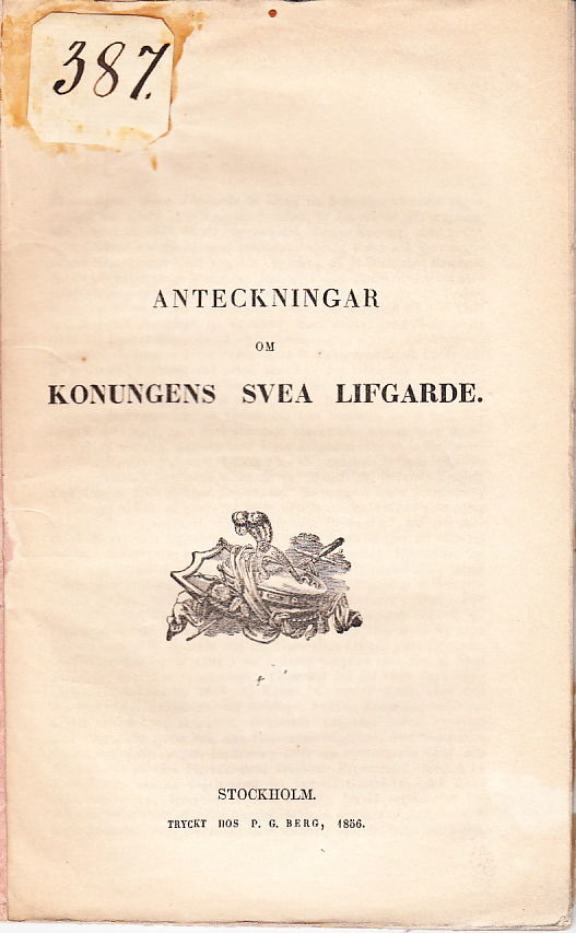 Stockholm, P. G. Berg, 1856. 8:o. 44 s. Reva genom s. 3-4. Häftad, i samtida pappersomslag med handtextad titel. Titelbladet med påklistat äldre signum ”387” i övre hörnet. Omslaget med Kammararkivets gamla stämpel. Bilagd handskriven lapp. Ovanliga första upplagan. Ett faksimil utkom 1976. Peter Olof Liljewalch (1807-77) var regementsläkare vid Svea livgarde och livmedikus åt bl. a. Oscar I och Carl XV.