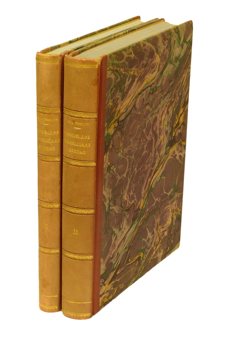 Göteborg, Förlagsaktiebolaget Västra Sverige, 1926-27. 8:o. (2),+ VIII,+ 257; (2),+ VIII,+ 326 s. Lätt nötta vinröda halvmarokängbd med rödstänkta snitt och medbundna främre omslag (Ivar Hanssons bokbinderi). Ryggarna lite blekta. Andra delen med författarens namnteckning på omslaget. Med Hans Rhodins och Nils Fries exlibris. Nr 77 av en numrerad upplaga på 100 exemplar på bättre papper.