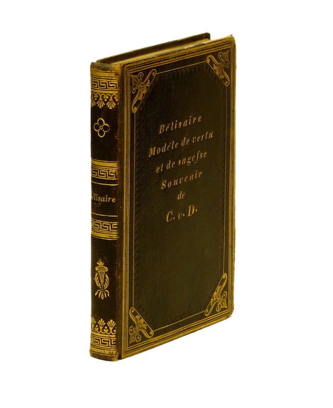 Paris, Chez Mme Veuve Dabo, 1824. 12mo. (4),+ 218 pp.+ 4 engraved plates. Small stains. Stamp ”S. D.” on title leaf. Very nice black contemporary morocco with gilt spine, boards and edges. Illegible signature on fly leaf. Front board with the gilt inscription ”Bélisaire. Modéle de vertu et de sagesse. Souvenir de C. v. D.” With the bookplate of Nils Fries.