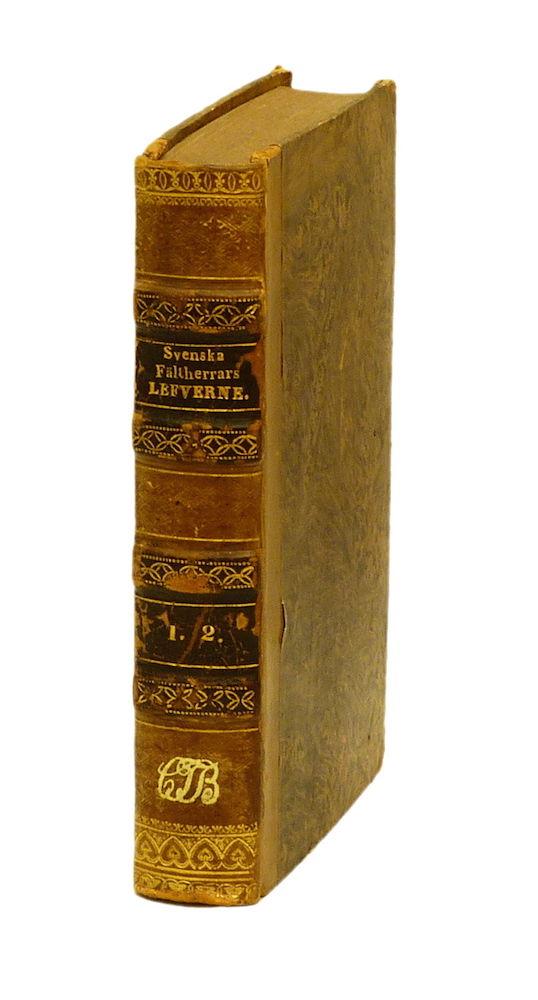 Stockholm, Zacharias Haeggström, 1821. 8:o. Litogr. porträtt,+ X,+ 278; (2),+ 281-706,+ (4) s. Första delen med lätta lagerfläckar, något mer på s. 105-112. Nära samtida något nött hfrbd, svart- och guldpräglad rygg med fyra breda upphöjda bind. Nötningar på de upphöjda binden. Från Trolleholm, med Carl Trolle Bondes förgyllda monogramprägling på ryggen. Setterwall 4954. Med både huvud (serie)- och deltitelbladet i första delen. Allt som utkom av A. M. Strinnholms planerade serie om fältherrar. Den utgavs även separat dvs. utan serietitelbladet samma år hos Ernst Ortman, dock utan porträttet, och troligen mindre omfattande. Förordet i del ett är signerat Nils M. Th.**. Porträttet är graverat av A. U. Berndes 1820.
