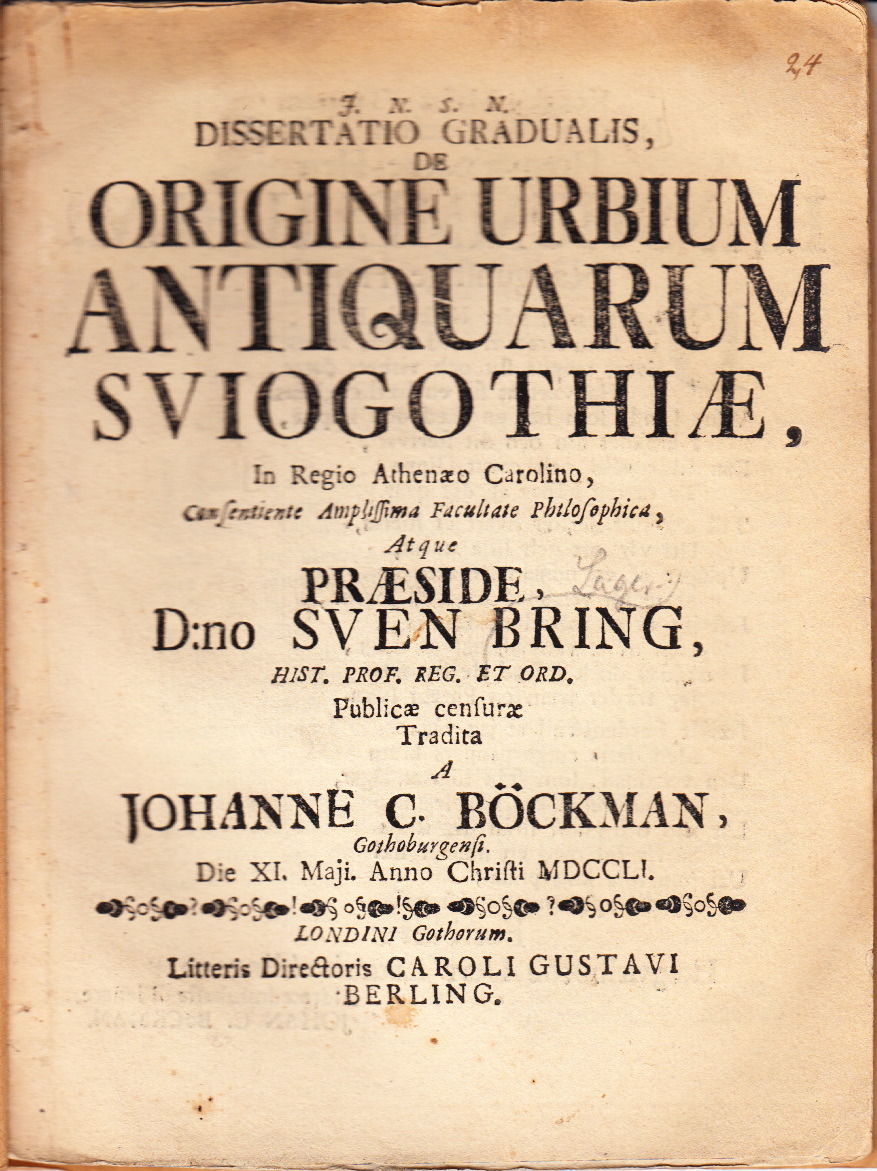 Lund, Caroli Gustavi Berling, (1751). 4:o. (4),+ 24,+ (2) s. Tryckt på tjockt papper. En träsnittsillustration (runsten). Häftad, med senare pappersomslag. Ur Bengt Löws bibliotek, med hans blyertsnamnteckning. Warmholtz 223. Gradualavhandling om upprinnelsen till städerna Uppsala, Sigtuna, Telje, Birka, Skara, Helsingborg och Lund. Johannes Böckman kom från Göteborg.