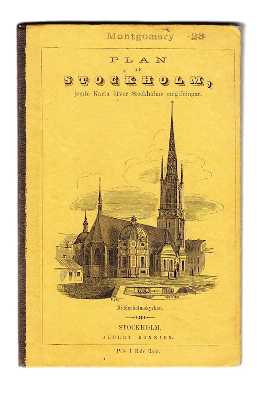 Stockholm, Albert Bonniers förlag, (1863). 8:o. (8) s.+ utvikbar litogr. karta (29 x 24,5 cm),+ utvikbar karta (14,5 x 22 cm). Förlagets klotryggsband med gula tryckta pappärmar. Främre pärmen med namnstämpeln ”Montgomery -28”. Främre pärmen med trägravyr föreställande Riddarholmskyrkan och bakre ”Stockholm från Mälaren”. Den mindra kartan med titeln ”Stockholms omgifningar”.