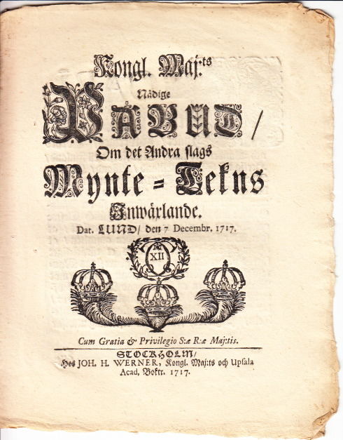 Kongl. maj:ts nådige påbud, om det andra slags mynte-tekns inwäxlande. Dat. Lund, den 7 decembr. 1717.