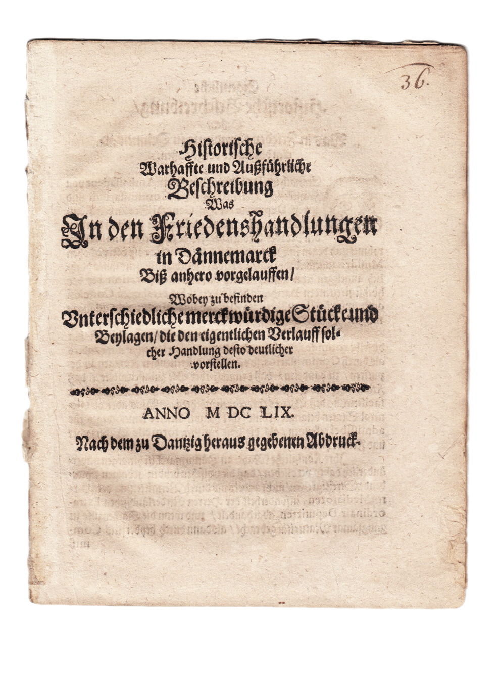 Historische warhaffte und auszführliche Beschreibung was in den Friedenshandlungen in Dännemarck biß anhero vorgelauffen, wobey zu befinden unterschiedliche merckwürdige Stücke und Beylagen, die den eigentlichen Verlauff solcher Handlung desto deutlicher vorstellen. Nach dem zu Dantzig heraus gegebenen Abruck.