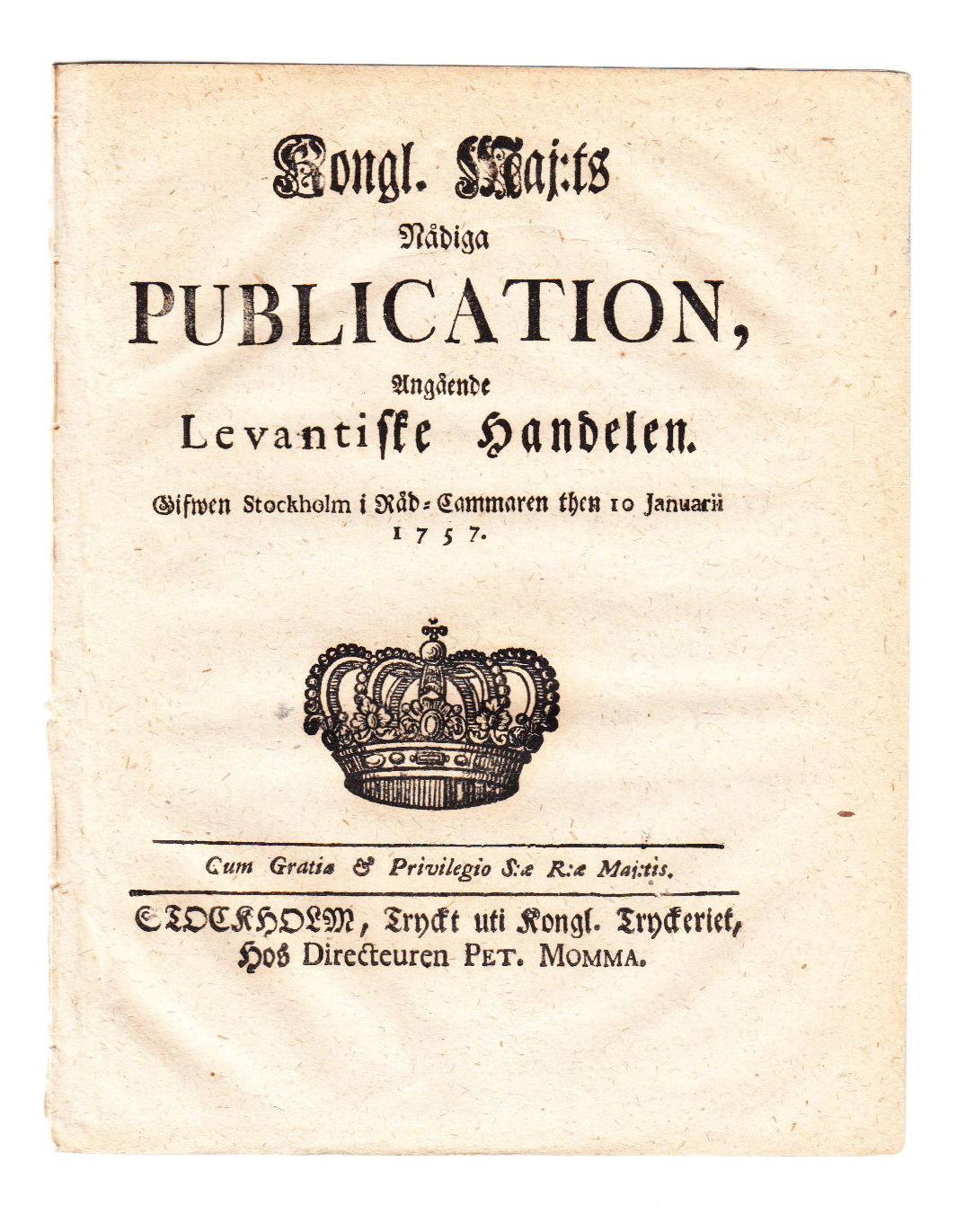 Kongl. Maj:ts nådiga publication angående levantiske handeln. Gifven Stockholm i Råd-Cammaren then 10 januarii 1757.