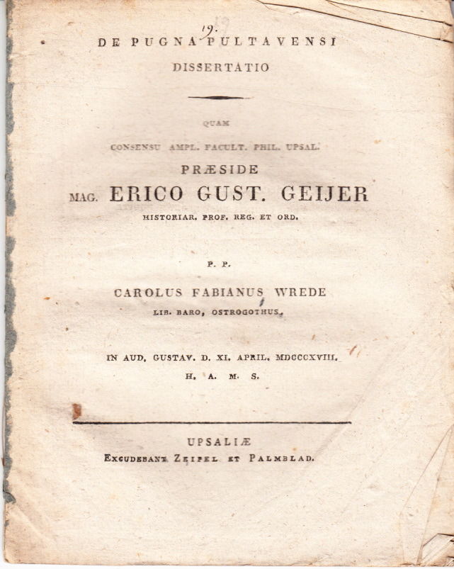 Uppsala, Zeipel et Palmblad, (1818). 4:o. (2),+ 18 s.+ utvikbar grav karta. Tagen ur band, med rester av ryggremsa. Marklin 19. Setterwall 2887. Kartan som är graverad av Edvard Personne visar marscherna åren 1700 till 1709 med en inflikt skiss över Poltava.